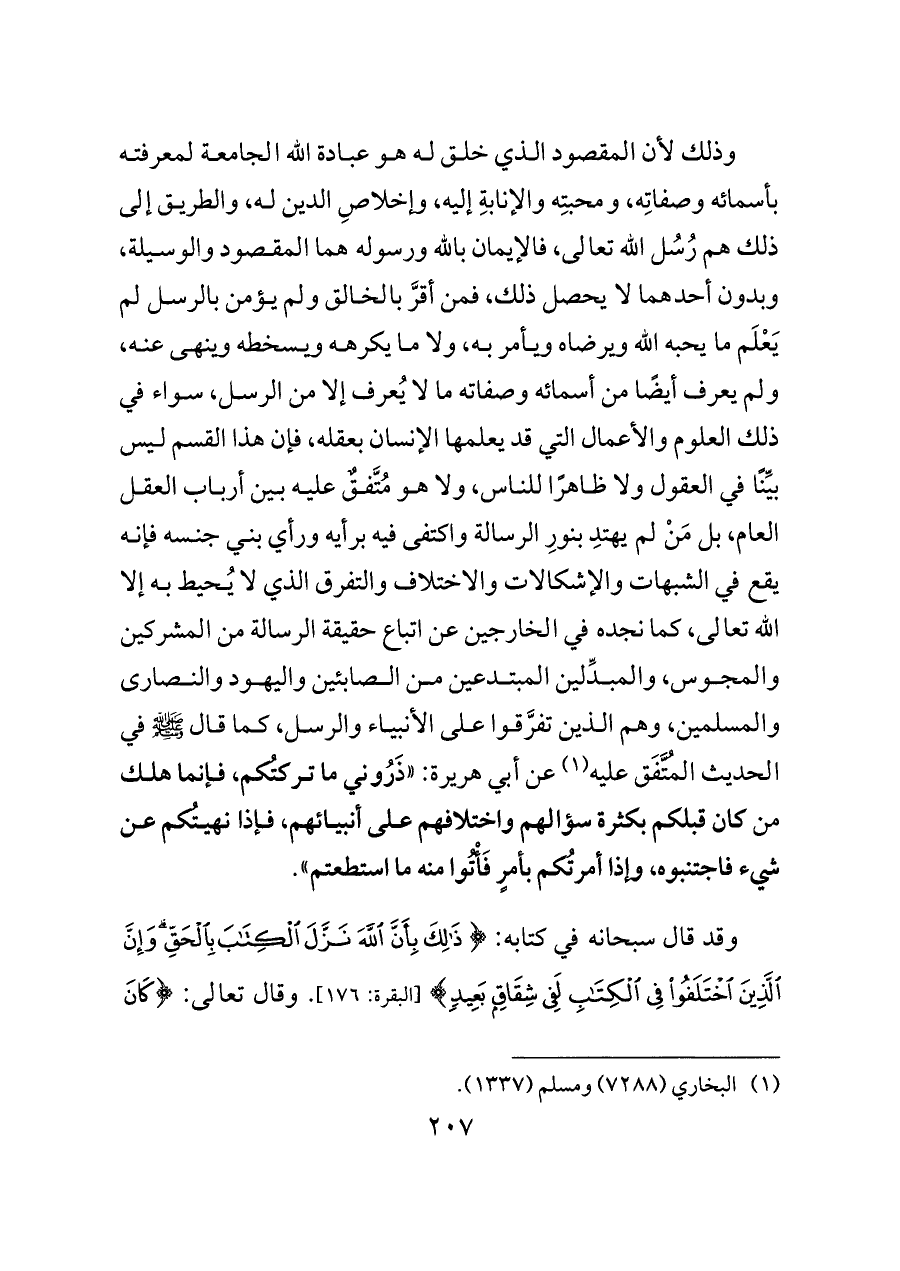 وذلك لأن المقصود الذي خلق له هو عبادة الله الجامعة لمعرفته بأسمائه وصفاتِه، ومحبتِه والإنابةِ إليه، وإخلاصِ الدين له، والطريق إلى ذلك هم رُسُل الله تعالى، فالإيمان بالله ورسوله هما المقصود والوسيلة، وبدون أحدهما لا يحصل ذلك، فمن أقرَّ بالخالق ولم يؤمن بالرسل لم يَعْلَم ما يحبه الله ويرضاه ويأمر به، ولا ما يكرهه ويسخطه وينهى عنه، ولم يعرف أيضًا من أسمائه وصفاته ما لا يُعرف إلا من الرسل، سواء في ذلك العلوم والأعمال التي قد يعلمها الإنسان بعقله، فإن هذا القسم ليس بيِّنًا في العقول ولا ظاهرًا للناس، ولا هو مُتَّفقٌ عليه بين أرباب العقل العام، بل مَنْ لم يهتدِ بنورِ الرسالة واكتفى فيه برأيه ورأي بني جنسه فإنه يقع في الشبهات والإشكالات والاختلاف والتفرق الذي لا يُحيط به إلا الله تعالى، كما نجده في الخارجين عن اتباع حقيقة الرسالة من المشركين والمجوس، والمبدِّلين المبتدعين من الصابئين واليهود والنصارى والمسلمين، وهم الذين تفرَّقوا على الأنبياء والرسل، كما قال - صلى الله عليه وسلم - في الحديث المُتَّفَق عليه (¬١) عن أبي هريرة: «ذَرُوني ما تركتُكم، فإنما هلك من كان قبلكم بكثرة سؤالهم واختلافهم على أنبيائهم، فإذا نهيتُكم عن شيء فاجتنبوه، وإذا أمرتُكم بأمرٍ فَأْتُوا منه ما استطعتم».