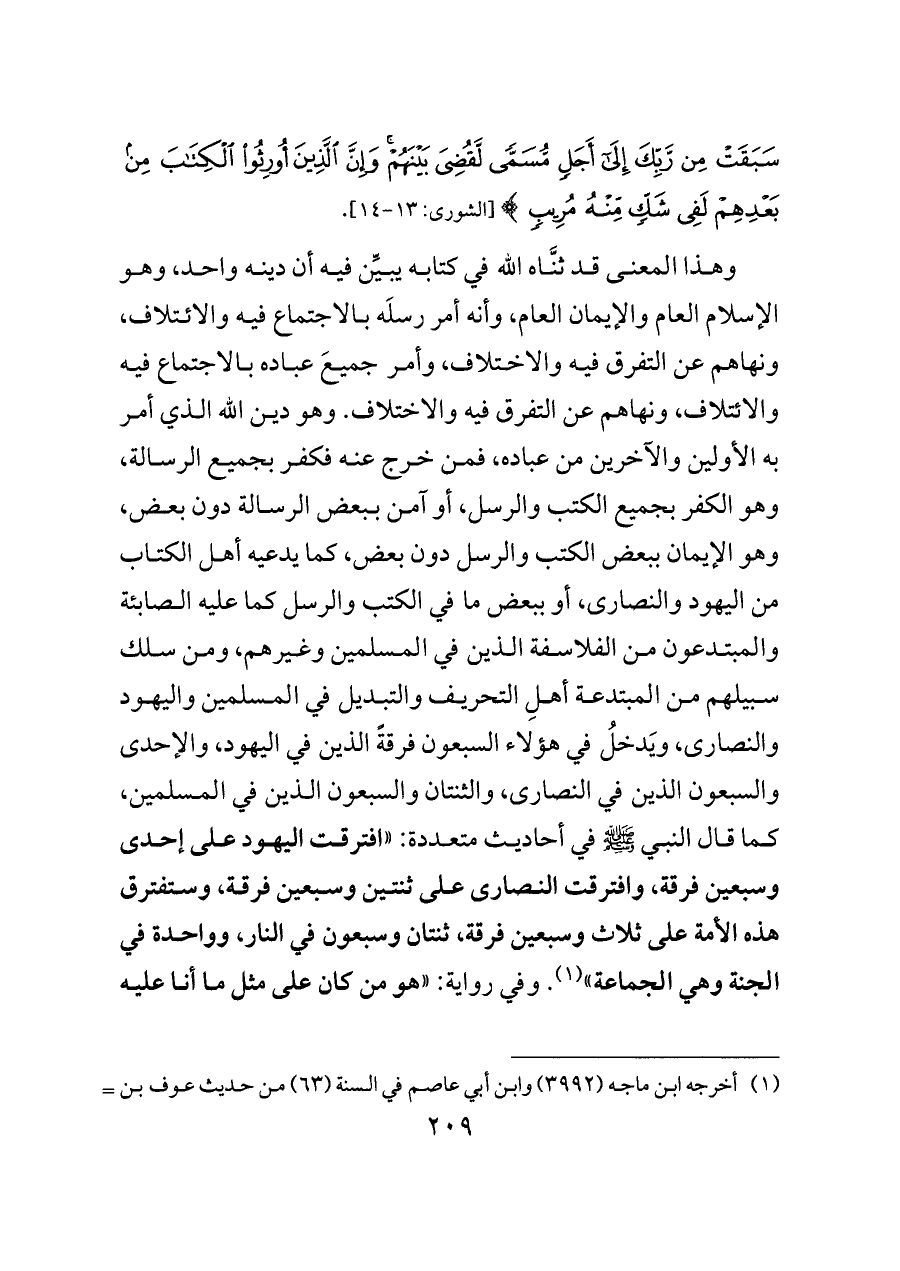 وهذا المعنى قد ثنَّاه الله في كتابه يبيِّن فيه أن دينه واحد، وهو الإسلام العام والإيمان العام، وأنه أمر رسلَه بالاجتماع فيه والائتلاف، ونهاهم عن التفرق فيه والاختلاف، وأمر جميعَ عباده بالاجتماع فيه والائتلاف، ونهاهم عن التفرق فيه والاختلاف. وهو دين الله الذي أمر به الأولين والآخرين من عباده، فمن خرج عنه فكفر بجميع الرسالة، وهو الكفر بجميع الكتب والرسل، أو آمن ببعض الرسالة دون بعض، وهو الإيمان ببعض الكتب والرسل دون بعض، كما يدعيه أهل الكتاب من اليهود والنصارى، أو ببعض ما في الكتب والرسل كما عليه الصابئة والمبتدعون من الفلاسفة الذين في المسلمين وغيرهم، ومن سلك سبيلهم من المبتدعة أهلِ التحريف والتبديل في المسلمين واليهود والنصارى، ويَدخلُ في هؤلاء السبعون فرقةً الذين في اليهود، والإحدى والسبعون الذين في النصارى، والثنتان والسبعون الذين في المسلمين، كما قال النبي - صلى الله عليه وسلم - في أحاديث متعددة: «افترقت اليهود على إحدى وسبعين فرقة، وافترقت النصارى على ثنتين وسبعين فرقة، وستفترق هذه الأمة على ثلاث وسبعين فرقة، ثنتان وسبعون في النار، وواحدة في الجنة وهي الجماعة» (¬١). وفي رواية: «هو من كان على مثل ما أنا عليه