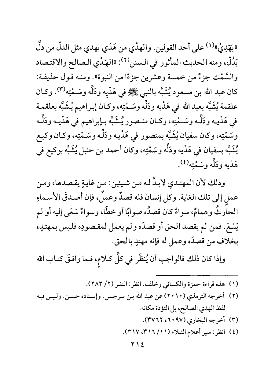 «يَهْدِيْ» (¬١) على أحد القولين. والهدْي من هَدَي يهدي مثل الدلّ من دلَّ يَدُلّ، ومنه الحديث المأثور في السنن (¬٢): «الهَدْي الصالح والاقتصاد والسَّمْت جزءٌ من خمسة وعشرين جزءًا من النبوة». ومنه قول حذيفة: كان عبد الله بن مسعود يُشَبَّه بالنبي - صلى الله عليه وسلم - في هَدْيِه ودَلِّه وسَمْتِه (¬٣). وكان علقمة يُشَبَّه بعبد الله في هَدْيه ودَلِّه وسَمْتِه، وكان إبراهيم يُشَبَّه بعلقمة في هَدْيه ودَلِّه وسَمْتِه، وكان منصور يُشَبَّه بإبراهيم في هَدْيه ودَلِّه وسَمْتِه، وكان سفيان يُشَبَّه بمنصور في هَدْيه ودَلِّه وسَمْتِه، وكان وكيع يُشَبَّه بسفيان في هَدْيه ودَلِّه وسَمْتِه، وكان أحمد بن حنبل يُشَبَّه بوكيع في هَدْيه ودَلِّه وسَمْتِه (¬٤).