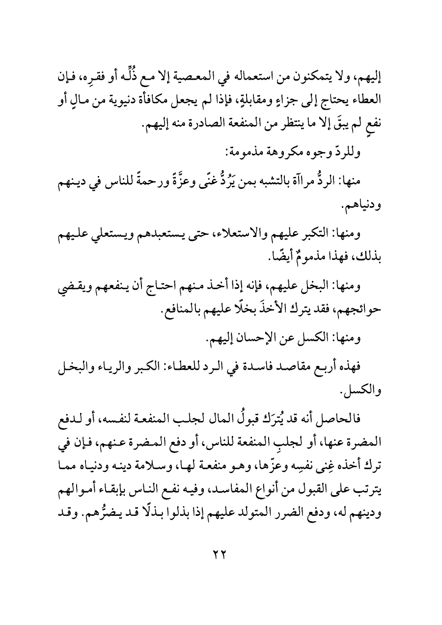 فالحاصل أنه قد يُترَك قبولُ المال لجلب المنفعة لنفسه، أو لدفع المضرة عنها، أو لجلبِ المنفعة للناس، أو دفع المضرة عنهم، فإن في ترك أخذه غِنى نفسِه وعزّها، وهو منفعة لها، وسلامة دينه ودنياه مما يترتب على القبول من أنواع المفاسد، وفيه نفع الناس بإبقاء أموالهم ودينهم له، ودفع الضرر المتولد عليهم إذا بذلوا بذلًا قد يضرُّهم. وقد