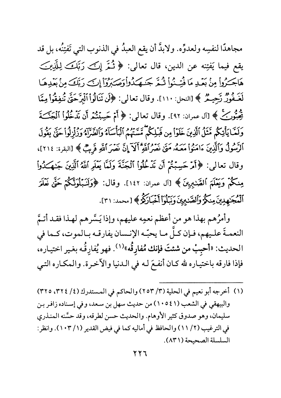 مجاهدًا لنفسِه ولعدوِّه. ولابدَّ أن يقع العبدُ في الذنوب التي تَفتِنُه، بل قد يقع فيما يَفتِنه عن الدين، قال تعالى: {ثُمَّ إِنَّ رَبَّكَ لِلَّذِينَ هَاجَرُوا مِنْ بَعْدِ مَا فُتِنُوا ثُمَّ جَاهَدُوا وَصَبَرُوا إِنَّ رَبَّكَ مِنْ بَعْدِهَا لَغَفُورٌ رَحِيمٌ} [النحل: ١١٠]. وقال تعالى: {لَنْ تَنَالُوا الْبِرَّ حَتَّى تُنْفِقُوا مِمَّا تُحِبُّونَ} [آل عمران: ٩٢]. وقال تعالى: {أَمْ حَسِبْتُمْ أَنْ تَدْخُلُوا الْجَنَّةَ وَلَمَّا يَأْتِكُمْ مَثَلُ الَّذِينَ خَلَوْا مِنْ قَبْلِكُمْ مَسَّتْهُمُ الْبَأْسَاءُ وَالضَّرَّاءُ وَزُلْزِلُوا حَتَّى يَقُولَ الرَّسُولُ وَالَّذِينَ آمَنُوا مَعَهُ مَتَى نَصْرُ اللَّهِ أَلَا إِنَّ نَصْرَ اللَّهِ قَرِيبٌ} [البقرة: ٢١٤]، وقال تعالى: {أَمْ حَسِبْتُمْ أَنْ تَدْخُلُوا الْجَنَّةَ وَلَمَّا يَعْلَمِ اللَّهُ الَّذِينَ جَاهَدُوا مِنْكُمْ وَيَعْلَمَ الصَّابِرِينَ} [آل عمران: ١٤٢]. وقال: {وَلَنَبْلُوَنَّكُمْ حَتَّى نَعْلَمَ الْمُجَاهِدِينَ مِنْكُمْ وَالصَّابِرِينَ وَنَبْلُوَ أَخْبَارَكُمْ} [محمد: ٣١].
