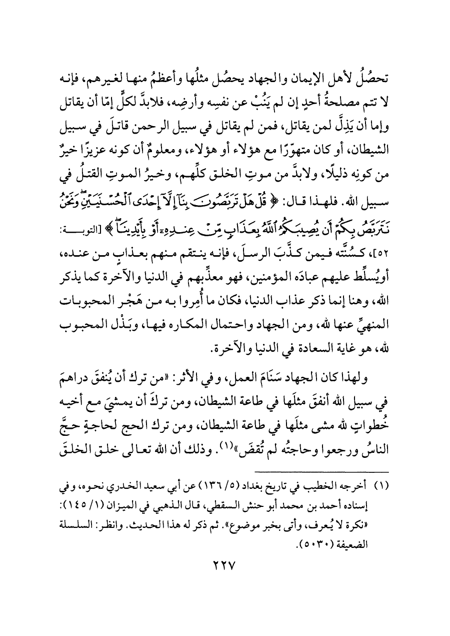 تحصُلُ لأهل الإيمان والجهاد يحصُل مثلُها وأعظمُ منها لغيرهم، فإنه لا تتم مصلحةُ أحدٍ إن لم يَنُبْ عن نفسِه وأرضِه، فلابدَّ لكلٍّ إمّا أن يقاتل وإما أن يَذِلَّ لمن يقاتل، فمن لم يقاتل في سبيل الرحمن قاتلَ في سبيل الشيطان، أو كان متهوّرًا مع هؤلاء أو هؤلاء، ومعلومٌ أن كونه عزيزًا خيرٌ من كونِه ذليلًا، ولابدَّ من موتِ الخلق كلِّهم، وخيرُ الموتِ القتلُ في سبيل الله. فلهذا قال: {قُلْ هَلْ تَرَبَّصُونَ بِنَا إِلَّا إِحْدَى الْحُسْنَيَيْنِ وَنَحْنُ نَتَرَبَّصُ بِكُمْ أَنْ يُصِيبَكُمُ اللَّهُ بِعَذَابٍ مِنْ عِنْدِهِ أَوْ بِأَيْدِينَا} [التوبة: ٥٢]، كسُنَّته فيمن كذَّبَ الرسلَ، فإنه ينتقم منهم بعذابٍ من عنده، أويُسلِّط عليهم عبادَه المؤمنين، فهو معذِّبهم في الدنيا والآخرة كما يذكر الله، وهنا إنما ذكر عذاب الدنيا، فكان ما أُمِروا به من هَجْر المحبوبات المنهيِّ عنها لله، ومن الجهاد واحتمال المكاره فيها، وبَذْل المحبوب لله، هو غاية السعادة في الدنيا والآخرة.