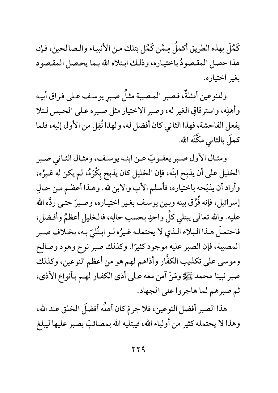 ومثال الأول صبر يعقوبَ عن ابنه يوسف، ومثال الثاني صبر الخليل على أن يذبح ابنَه، فإن الخليل كان يذبح بِكْرَهُ، لم يكن له غيرُه، وأراد أن يذبَحه باختياره، فأسلم الأب والابن لله. وهذا أعظم من حالِ إسرائيل، فإنه فُرِّق بينه وبين يوسف بغير اختياره، وصبرَ حتى ردَّه الله عليه. والله تعالى يبتلي كلَّ واحدٍ بحسب حالِه، فالخليل أعظمُ وأفضل، فاحتملَ هذا البلاء الذي لا يحتمله غيرُه لو ابتُليَ به، بخلاف صبر المصيبة، فإن الصبر عليه موجود كثيرًا. وكذلك صبر نوح وهود وصالح وموسى على تكذيب الكفَّار وأذاهم لهم هو من أعظم النوعين، وكذلك صبر نبينا محمد - صلى الله عليه وسلم - ومَنْ آمن معه على أذى الكفار لهم بأنواع الأذى، ثم صبرهم لما هاجروا على الجهاد.