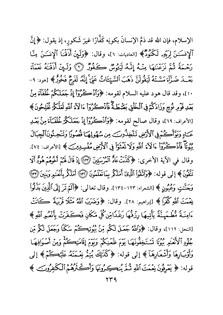 الإسلام، فإن الله قد ذمَّ الإنسانَ بكونِه كَفَّارًا غيرَ شَكورٍ، إذ يقول: {إِنَّ الْإِنْسَانَ لِرَبِّهِ لَكَنُودٌ} [العاديات: ٦]، وقال: {وَلَئِنْ أَذَقْنَا الْإِنْسَانَ مِنَّا رَحْمَةً ثُمَّ نَزَعْنَاهَا مِنْهُ إِنَّهُ لَيَئُوسٌ كَفُورٌ (٩) وَلَئِنْ أَذَقْنَاهُ نَعْمَاءَ بَعْدَ ضَرَّاءَ مَسَّتْهُ لَيَقُولَنَّ ذَهَبَ السَّيِّئَاتُ عَنِّي إِنَّهُ لَفَرِحٌ فَخُورٌ} [هود: ٩ - ١٠]، وقد قال هود عليه السلام لقومه: {وَاذْكُرُوا إِذْ جَعَلَكُمْ خُلَفَاءَ مِنْ بَعْدِ قَوْمِ نُوحٍ وَزَادَكُمْ فِي الْخَلْقِ بَسْطَةً فَاذْكُرُوا آلَاءَ اللَّهِ لَعَلَّكُمْ تُفْلِحُونَ} [الأعراف: ٦٩]، وقال صالح لقومه: {وَاذْكُرُوا إِذْ جَعَلَكُمْ خُلَفَاءَ مِنْ بَعْدِ عَادٍ وَبَوَّأَكُمْ فِي الْأَرْضِ تَتَّخِذُونَ مِنْ سُهُولِهَا قُصُورًا وَتَنْحِتُونَ الْجِبَالَ بُيُوتًا فَاذْكُرُوا آلَاءَ اللَّهِ وَلَا تَعْثَوْا فِي الْأَرْضِ مُفْسِدِينَ} [الأعراف: ٧٤]. وقال في الآية الأخرى: {كَذَّبَتْ عَادٌ الْمُرْسَلِينَ (١٢٣) إِذْ قَالَ لَهُمْ أَخُوهُمْ هُودٌ أَلَا تَتَّقُونَ} إلى قوله: {وَاتَّقُوا الَّذِي أَمَدَّكُمْ بِمَا تَعْلَمُونَ (١٣٢) أَمَدَّكُمْ بِأَنْعَامٍ وَبَنِينَ (١٣٣) وَجَنَّاتٍ وَعُيُونٍ} [الشعراء: ١٢٣ - ١٣٤]. وقال تعالى: {أَلَمْ تَرَ إِلَى الَّذِينَ بَدَّلُوا نِعْمَتَ اللَّهِ كُفْرًا} [إبراهيم: ٢٨].