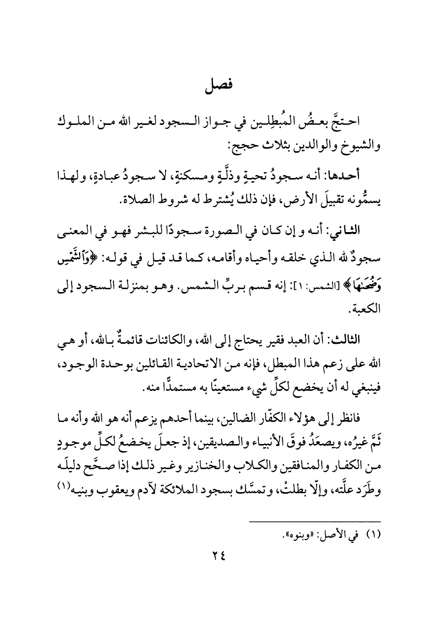 فانظر إلى هؤلاء الكفّار الضالين، بينما أحدهم يزعم أنه هو الله وأنه ما ثَمَّ غيرُه، ويصعَدُ فوقَ الأنبياء والصديقين، إذ جعلَ يخضعُ لكلِّ موجودٍ من الكفار والمنافقين والكلاب والخنازير وغير ذلك إذا صحَّح دليلَه وطَرَد علَّته، وإلّا بطلتْ، وتمسَّك بسجود الملائكة لآدم ويعقوب وبنيه (¬١)