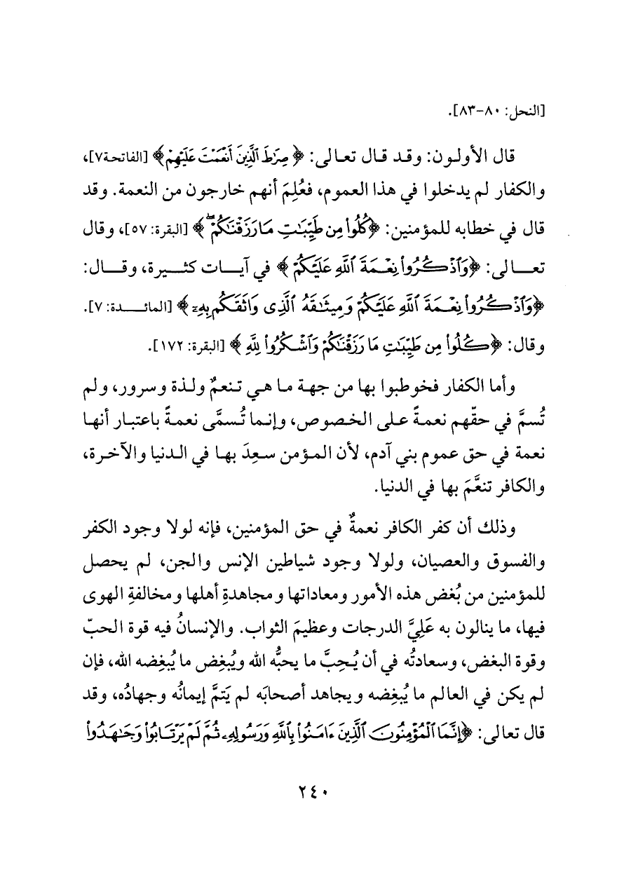 قال الأولون: وقد قال تعالى: {صِرَاطَ الَّذِينَ أَنْعَمْتَ عَلَيْهِمْ} [الفاتحة ٧]، والكفار لم يدخلوا في هذا العموم، فعُلِمَ أنهم خارجون من النعمة. وقد قال في خطابه للمؤمنين: {كُلُوا مِنْ طَيِّبَاتِ مَا رَزَقْنَاكُمْ} [البقرة: ٥٧]، وقال تعالى: {وَاذْكُرُوا نِعْمَةَ اللَّهِ عَلَيْكُمْ} في آيات كثيرة، وقال: {وَاذْكُرُوا نِعْمَةَ اللَّهِ عَلَيْكُمْ وَمِيثَاقَهُ الَّذِي وَاثَقَكُمْ بِهِ} [المائدة: ٧]. وقال: {كُلُوا مِنْ طَيِّبَاتِ مَا رَزَقْنَاكُمْ وَاشْكُرُوا لِلَّهِ} [البقرة: ١٧٢].