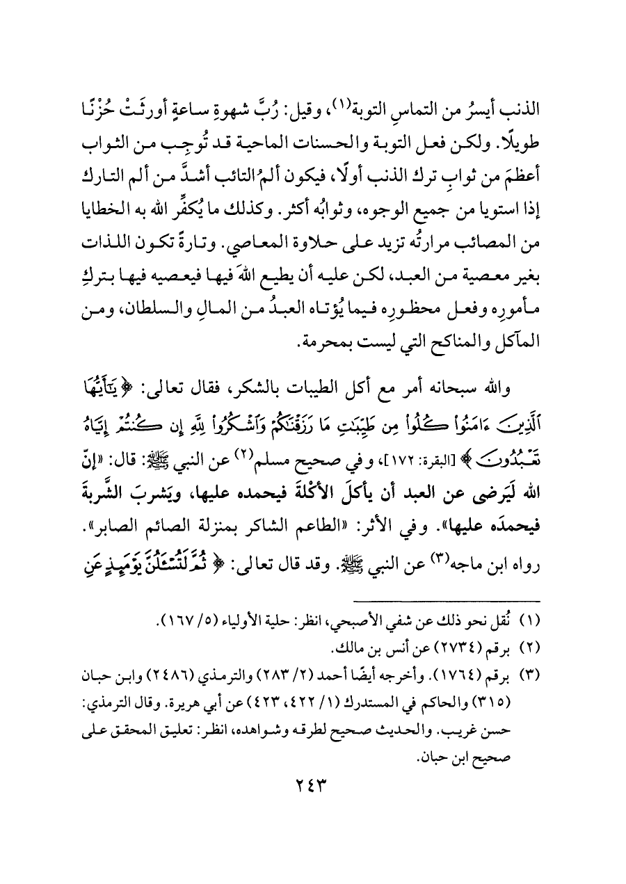 والله سبحانه أمر مع أكل الطيبات بالشكر، فقال تعالى: {يَاأَيُّهَا الَّذِينَ آمَنُوا كُلُوا مِنْ طَيِّبَاتِ مَا رَزَقْنَاكُمْ وَاشْكُرُوا لِلَّهِ إِنْ كُنْتُمْ إِيَّاهُ تَعْبُدُونَ} [البقرة: ١٧٢]، وفي صحيح مسلم (¬٢) عن النبي - صلى الله عليه وسلم -: قال: «إنّ الله لَيَرضى عن العبد أن يأكلَ الأكْلةَ فيحمده عليها، ويَشربَ الشَّربةَ فيحمدَه عليها». وفي الأثر: «الطاعم الشاكر بمنزلة الصائم الصابر». رواه ابن ماجه (¬٣) عن النبي - صلى الله عليه وسلم -. وقد قال تعالى: {ثُمَّ لَتُسْأَلُنَّ يَوْمَئِذٍ عَنِ