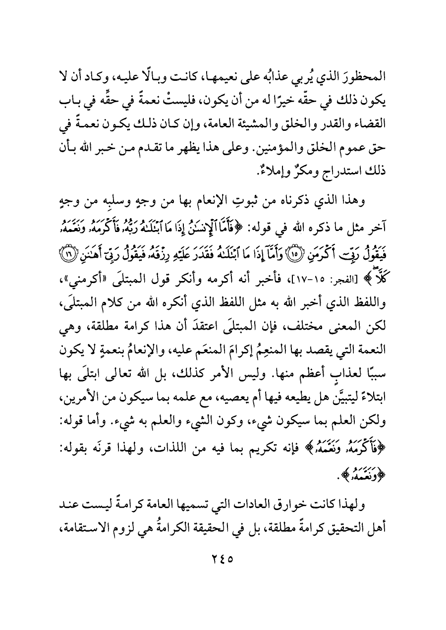 وهذا الذي ذكرناه من ثبوتِ الإنعام بها من وجهٍ وسلبِه من وجهٍ آخر مثل ما ذكره الله في قوله: {فَأَمَّا الْإِنْسَانُ إِذَا مَا ابْتَلَاهُ رَبُّهُ فَأَكْرَمَهُ وَنَعَّمَهُ فَيَقُولُ رَبِّي أَكْرَمَنِ (١٥) وَأَمَّا إِذَا مَا ابْتَلَاهُ فَقَدَرَ عَلَيْهِ رِزْقَهُ فَيَقُولُ رَبِّي أَهَانَنِ (١٦) كَلَّا} [الفجر: ١٥ - ١٧]، فأخبر أنه أكرمه وأنكر قول المبتلَى «أكرمني»، واللفظ الذي أخبر الله به مثل اللفظ الذي أنكره الله من كلام المبتلَى، لكن المعنى مختلف، فإن المبتلَى اعتقدَ أن هذا كرامة مطلقة، وهي النعمة التي يقصد بها المنعِمُ إكرامَ المنعَم عليه، والإنعامُ بنعمةٍ لا يكون سببًا لعذابٍ أعظم منها. وليس الأمر كذلك، بل الله تعالى ابتلَى بها ابتلاءً ليتبيَّن هل يطيعه فيها أم يعصيه، مع علمه بما سيكون من الأمرين، ولكن العلم بما سيكون شيء، وكون الشيء والعلم به شيء. وأما قوله: {فَأَكْرَمَهُ وَنَعَّمَهُ} فإنه تكريم بما فيه من اللذات، ولهذا قرنَه بقوله: {وَنَعَّمَهُ}.