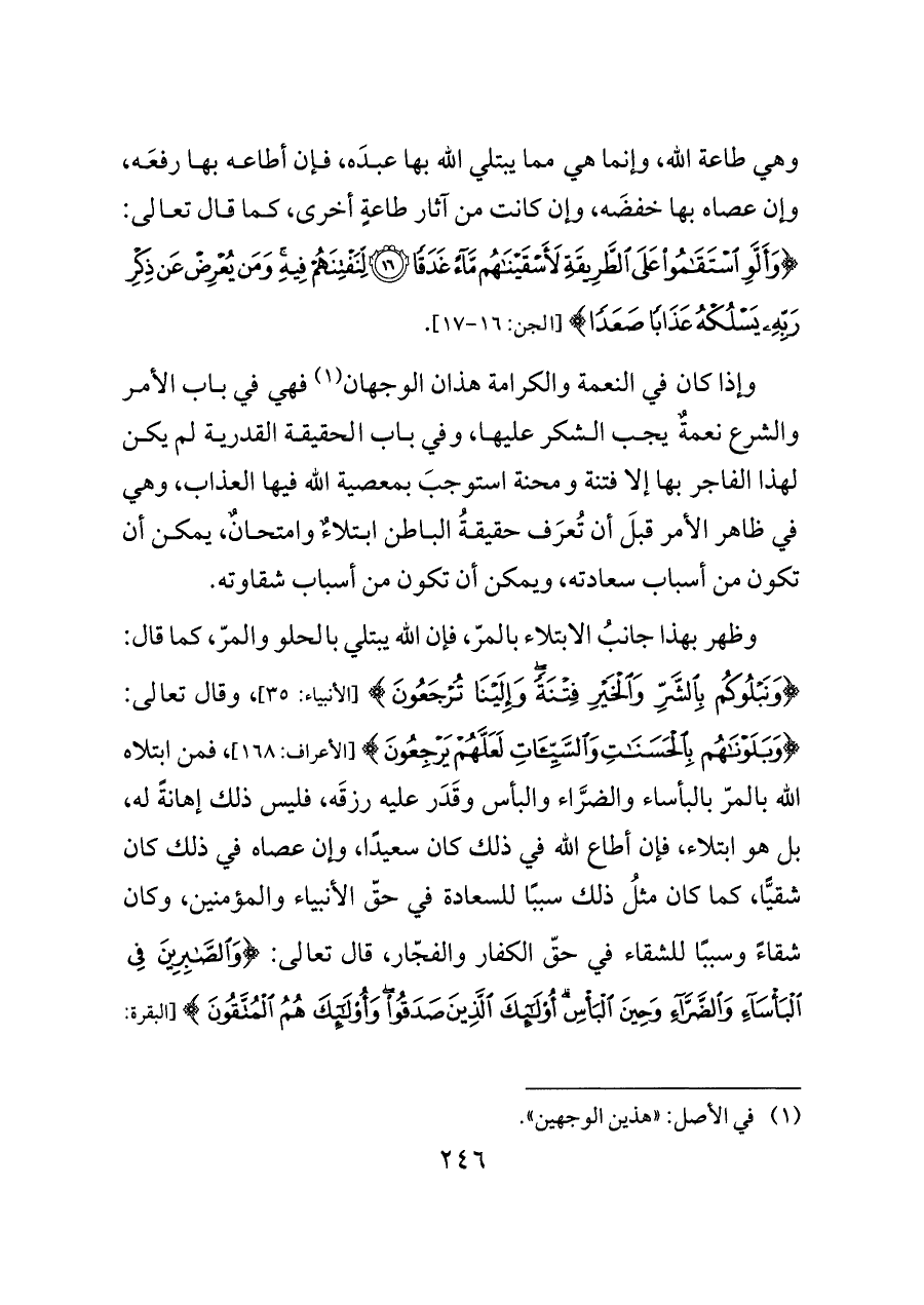 وإذا كان في النعمة والكرامة هذان الوجهان (¬١) فهي في باب الأمر والشرع نعمةٌ يجب الشكر عليها، وفي باب الحقيقة القدرية لم يكن لهذا الفاجر بها إلا فتنة ومحنة استوجبَ بمعصية الله فيها العذاب، وهي في ظاهر الأمر قبلَ أن تُعرَف حقيقةُ الباطن ابتلاءٌ وامتحانٌ، يمكن أن تكون من أسباب سعادته، ويمكن أن تكون من أسباب شقاوته.