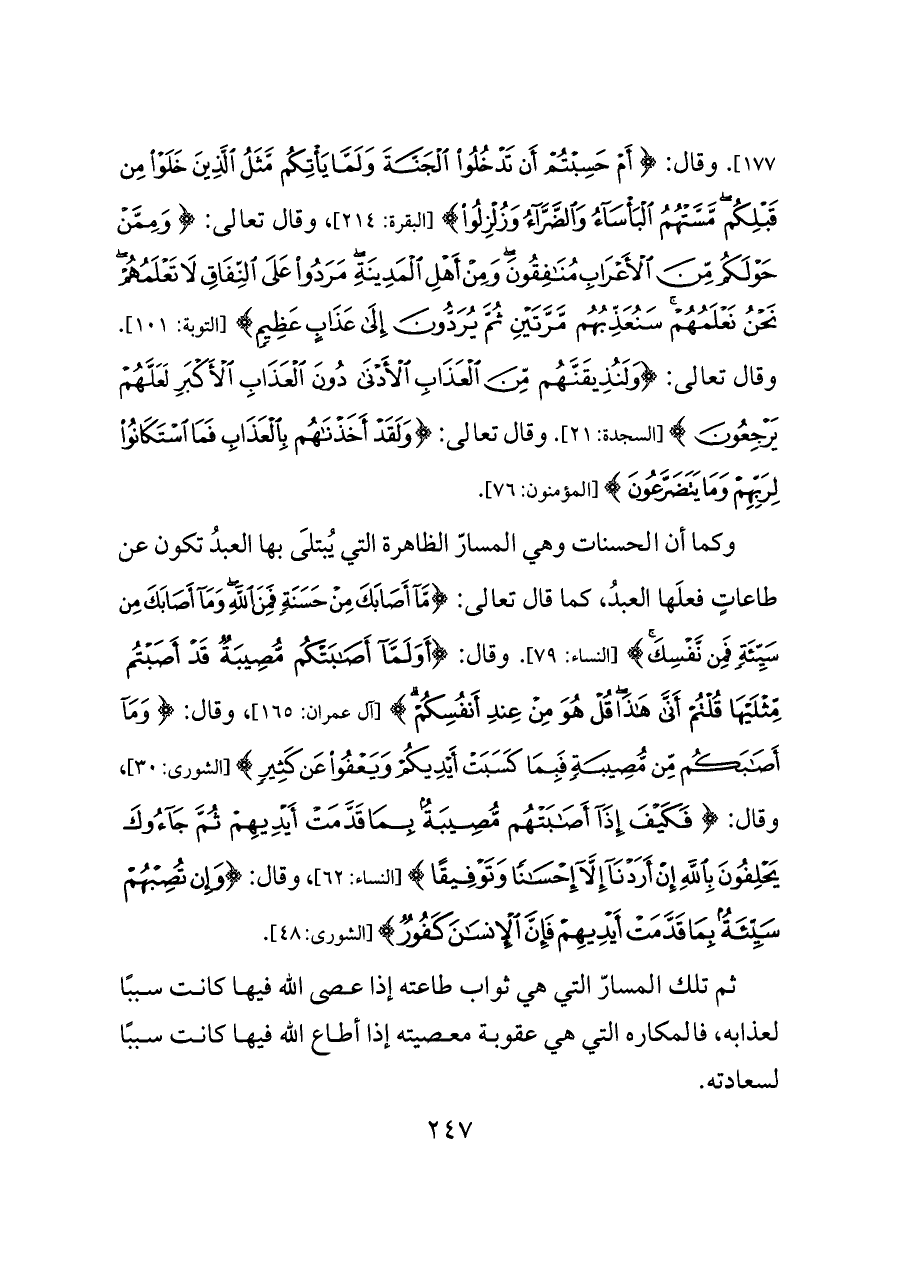 ١٧٧]. وقال: {أَمْ حَسِبْتُمْ أَنْ تَدْخُلُوا الْجَنَّةَ وَلَمَّا يَأْتِكُمْ مَثَلُ الَّذِينَ خَلَوْا مِنْ قَبْلِكُمْ مَسَّتْهُمُ الْبَأْسَاءُ وَالضَّرَّاءُ وَزُلْزِلُوا} [البقرة: ٢١٤]، وقال تعالى: {وَمِمَّنْ حَوْلَكُمْ مِنَ الْأَعْرَابِ مُنَافِقُونَ وَمِنْ أَهْلِ الْمَدِينَةِ مَرَدُوا عَلَى النِّفَاقِ لَا تَعْلَمُهُمْ نَحْنُ نَعْلَمُهُمْ سَنُعَذِّبُهُمْ مَرَّتَيْنِ ثُمَّ يُرَدُّونَ إِلَى عَذَابٍ عَظِيمٍ} [التوبة: ١٠١]. وقال تعالى: {وَلَنُذِيقَنَّهُمْ مِنَ الْعَذَابِ الْأَدْنَى دُونَ الْعَذَابِ الْأَكْبَرِ لَعَلَّهُمْ يَرْجِعُونَ} [السجدة: ٢١]. وقال تعالى: {وَلَقَدْ أَخَذْنَاهُمْ بِالْعَذَابِ فَمَا اسْتَكَانُوا لِرَبِّهِمْ وَمَا يَتَضَرَّعُونَ} [المؤمنون: ٧٦].