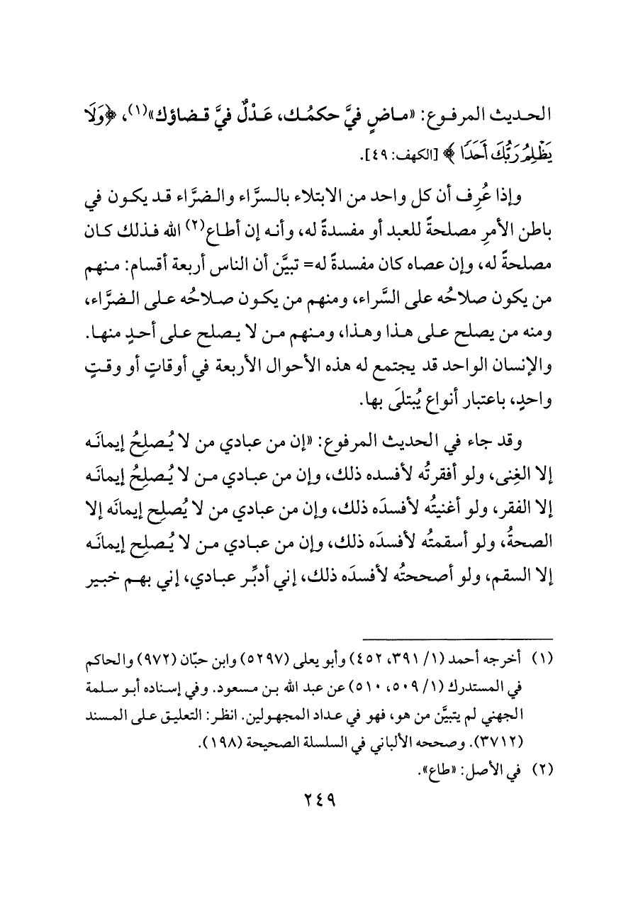 وقد جاء في الحديث المرفوع: «إن من عبادي من لا يُصلِحُ إيمانَه إلا الغِنى، ولو أفقرتُه لأفسده ذلك، وإن من عبادي من لا يُصلِحُ إيمانَه إلا الفقر، ولو أغنيتُه لأفسدَه ذلك، وإن من عبادي من لا يُصلِح إيمانَه إلا الصحةُ، ولو أسقمتُه لأفسدَه ذلك، وإن من عبادي من لا يُصلِح إيمانَه إلا السقم، ولو أصححتُه لأفسدَه ذلك، إني أدبِّر عبادي، إني بهم خبير
