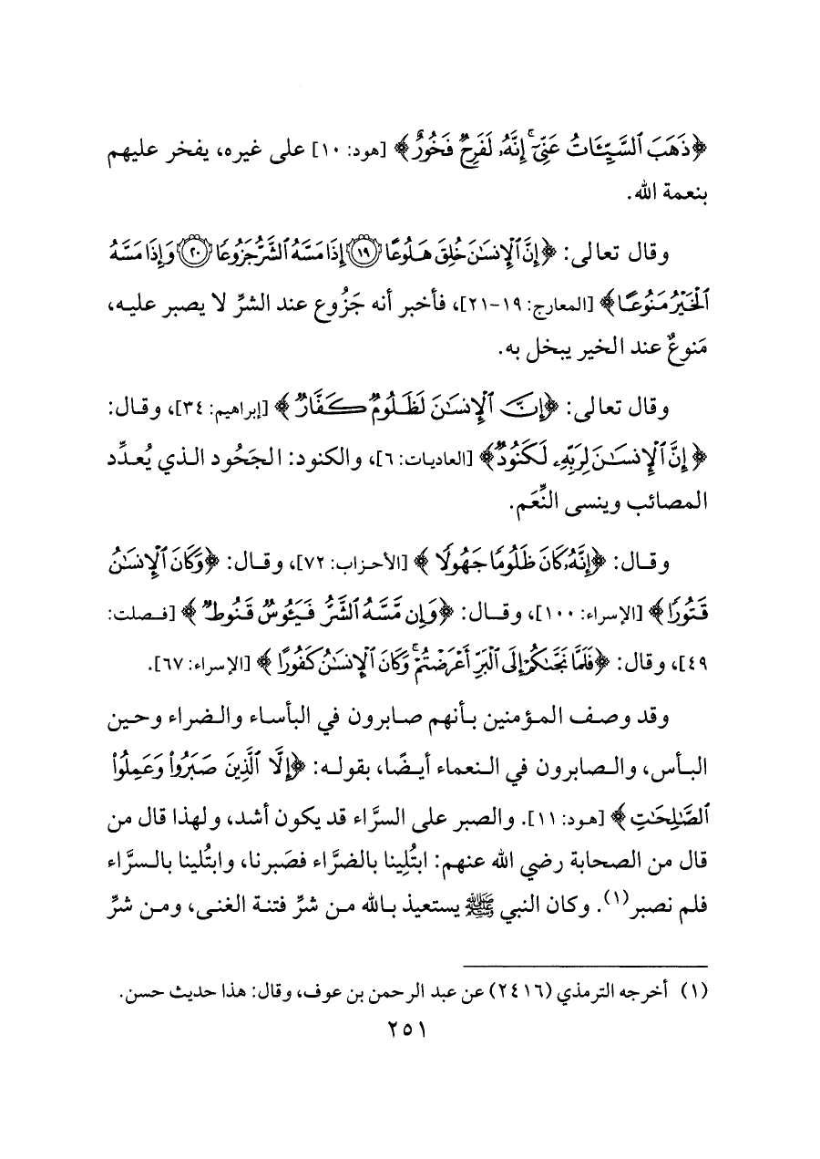 وقال: {إِنَّهُ كَانَ ظَلُومًا جَهُولًا} [الأحزاب: ٧٢]، وقال: {وَكَانَ الْإِنْسَانُ قَتُورًا} [الإسراء: ١٠٠]، وقال: {وَإِنْ مَسَّهُ الشَّرُّ فَيَئُوسٌ قَنُوطٌ} [فصلت: ٤٩]، وقال: {فَلَمَّا نَجَّاكُمْ إِلَى الْبَرِّ أَعْرَضْتُمْ وَكَانَ الْإِنْسَانُ كَفُورًا} [الإسراء: ٦٧].
