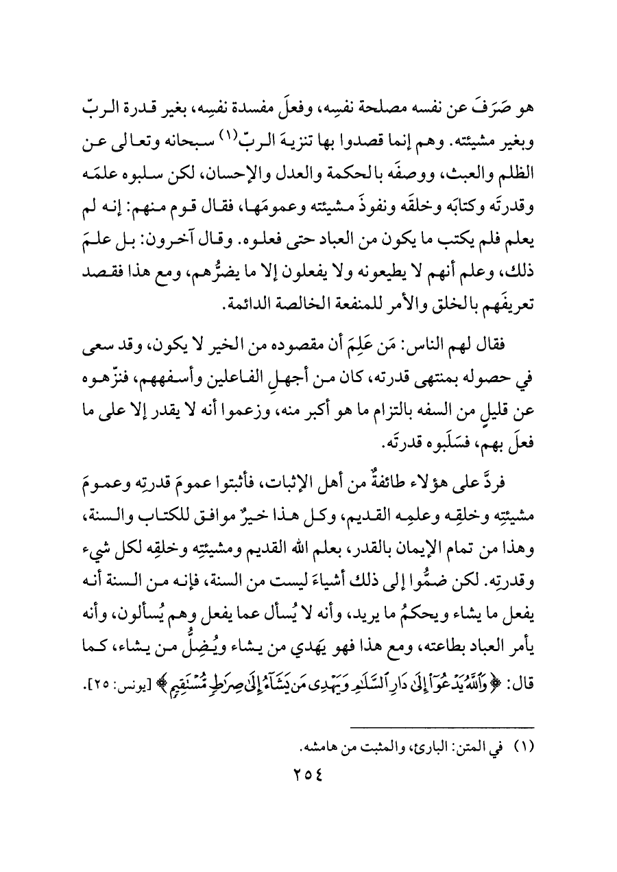 هو صَرَفَ عن نفسه مصلحة نفسِه، وفعلَ مفسدة نفسِه، بغير قدرة الربّ وبغير مشيئته. وهم إنما قصدوا بها تنزيهَ الربّ (¬١) سبحانه وتعالى عن الظلم والعبث، ووصفَه بالحكمة والعدل والإحسان، لكن سلبوه علمَه وقدرتَه وكتابَه وخلقَه ونفوذَ مشيئته وعمومَها، فقال قوم منهم: إنه لم يعلم فلم يكتب ما يكون من العباد حتى فعلوه. وقال آخرون: بل علمَ ذلك، وعلم أنهم لا يطيعونه ولا يفعلون إلا ما يضرُّهم، ومع هذا فقصد تعريفَهم بالخلق والأمر للمنفعة الخالصة الدائمة.