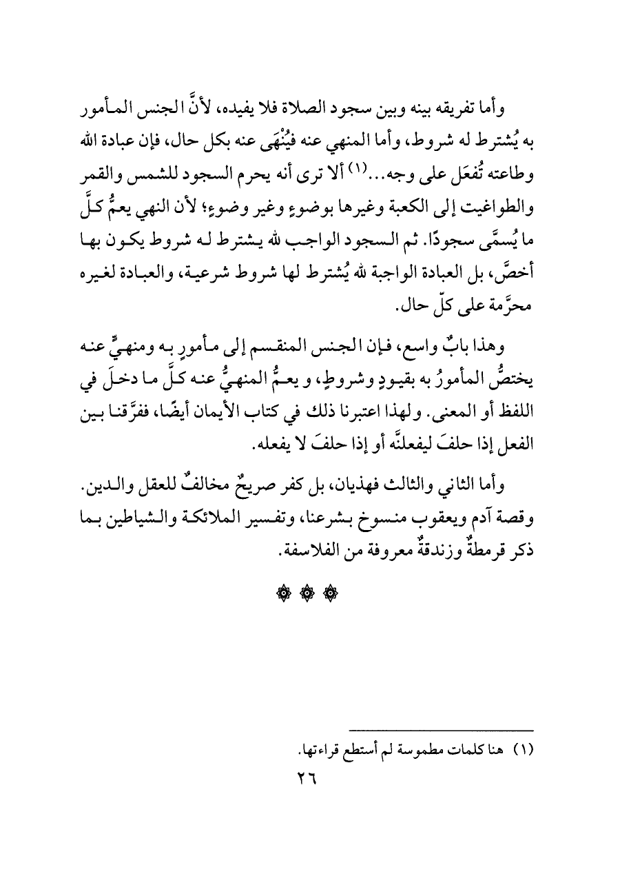 وأما الثاني والثالث فهذيان، بل كفر صريحٌ مخالفٌ للعقل والدين. وقصة آدم ويعقوب منسوخ بشرعنا، وتفسير الملائكة والشياطين بما ذكر قرمطةٌ وزندقةٌ معروفة من الفلاسفة.