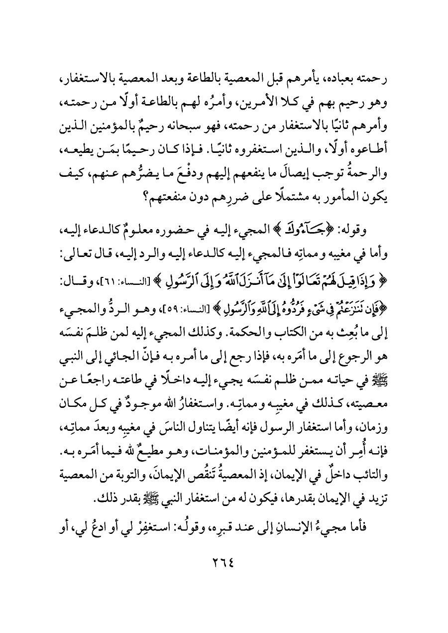 وقوله: {جَاءُوكَ} المجيء إليه في حضوره معلومٌ كالدعاء إليه، وأما في مغيبه ومماتِه فالمجيء إليه كالدعاء إليه والرد إليه، قال تعالى: {وَإِذَا قِيلَ لَهُمْ تَعَالَوْا إِلَى مَا أَنْزَلَ اللَّهُ وَإِلَى الرَّسُولِ} [النساء: ٦١]، وقال: {فَإِنْ تَنَازَعْتُمْ فِي شَيْءٍ فَرُدُّوهُ إِلَى اللَّهِ وَالرَّسُولِ} [النساء: ٥٩]، وهو الردُّ والمجيء إلى ما بُعِث به من الكتاب والحكمة. وكذلك المجيء إليه لمن ظلمَ نفسَه هو الرجوع إلى ما أمَره به، فإذا رجع إلى ما أمره به فإنّ الجائي إلى النبي - صلى الله عليه وسلم - في حياته ممن ظلم نفسَه يجيء إليه داخلًا في طاعته راجعًا عن معصيته، كذلك في مغيبِه ومماتِه. واستغفارُ الله موجودٌ في كل مكان وزمان، وأما استغفار الرسول فإنه أيضًا يتناول الناسَ في مغيبِه وبعدَ مماتِه، فإنه أُمِر أن يستغفر للمؤمنين والمؤمنات، وهو مطيعٌ لله فيما أمَره به. والتائب داخلٌ في الإيمان، إذ المعصيةُ تَنقُص الإيمانَ، والتوبة من المعصية تزيد في الإيمان بقدرها، فيكون له من استغفار النبي - صلى الله عليه وسلم - بقدر ذلك.