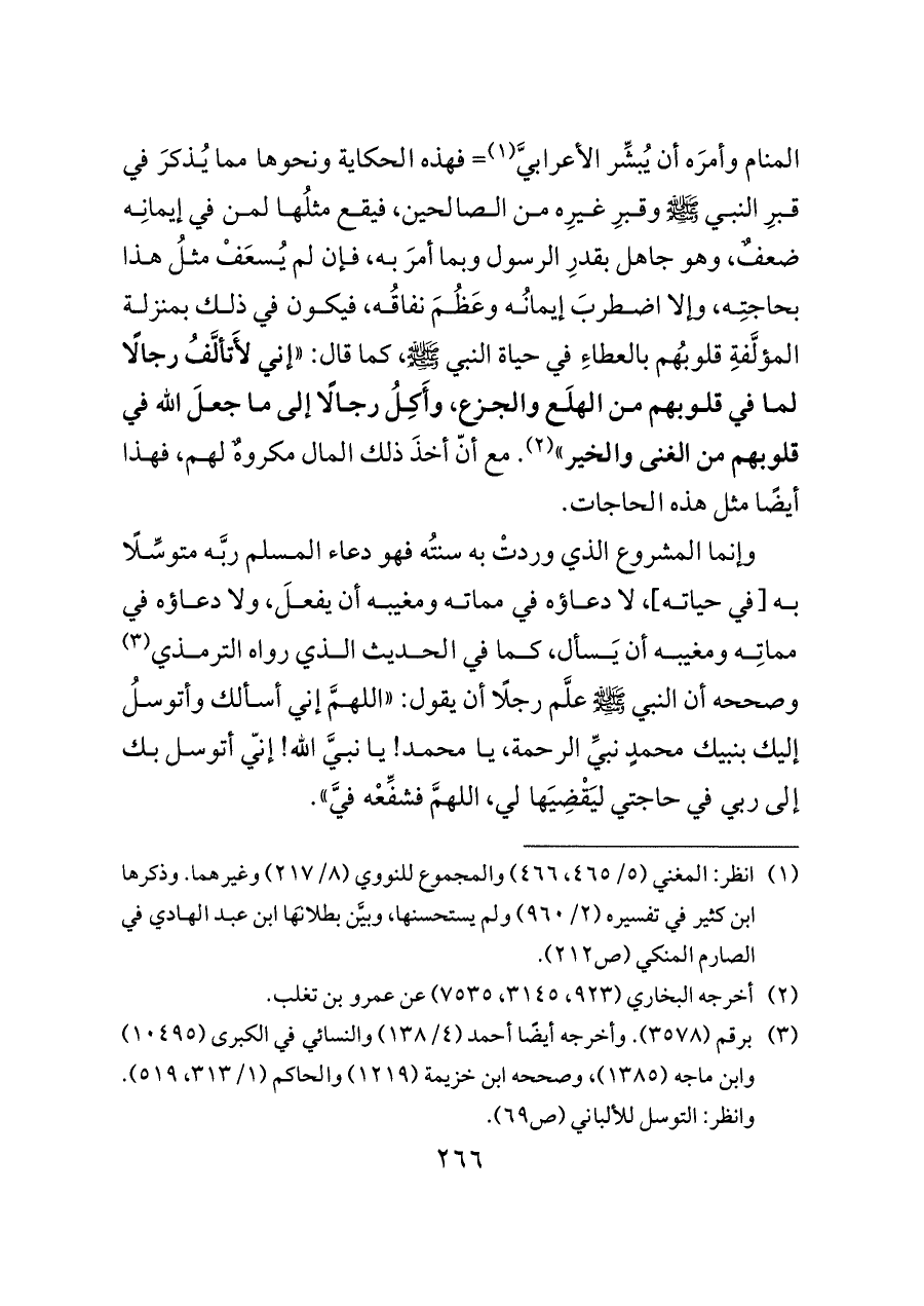 المنام وأمرَه أن يُبشِّر الأعرابيَّ (¬١) = فهذه الحكاية ونحوها مما يُذكرَ في قبرِ النبي - صلى الله عليه وسلم - وقبرِ غيرِه من الصالحين، فيقع مثلُها لمن في إيمانِه ضعفٌ، وهو جاهل بقدرِ الرسول وبما أمرَ به، فإن لم يُسعَفْ مثلُ هذا بحاجتِه، وإلا اضطربَ إيمانُه وعَظُمَ نفاقُه، فيكون في ذلك بمنزلة المؤلَّفةِ قلوبُهم بالعطاءِ في حياة النبي - صلى الله عليه وسلم -، كما قال: «إني لأَتألَّفُ رجالًا لما في قلوبهم من الهلَع والجزع، وأَكِلُ رجالًا إلى ما جعلَ الله في قلوبهم من الغنى والخير» (¬٢). مع أنّ أخذَ ذلك المال مكروهٌ لهم، فهذا أيضًا مثل هذه الحاجات.