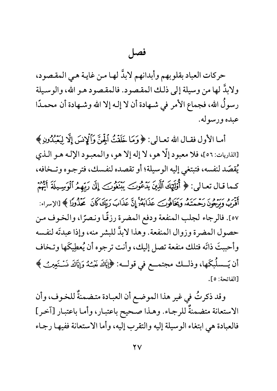 حركات العباد بقلوبهم وأبدانهم لابدَّ لها من غاية هي المقصود، ولابدَّ لها من وسيلة إلى ذلك المقصود. فالمقصود هو الله، والوسيلة رسولُ الله، فجماع الأمر في شهادة أن لا إله إلا الله وشهادة أن محمدًا عبده ورسوله.