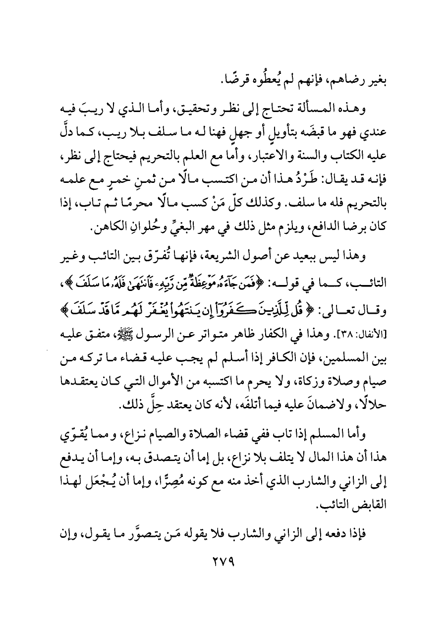 وهذه المسألة تحتاج إلى نظر وتحقيق، وأما الذي لا ريبَ فيه عندي فهو ما قبضَه بتأويلٍ أو جهلٍ فهنا له ما سلف بلا ريب، كما دلَّ عليه الكتاب والسنة والاعتبار، وأما مع العلم بالتحريم فيحتاج إلى نظر، فإنه قد يقال: طَرْدُ هذا أن من اكتسب مالًا من ثمنِ خمرٍ مع علمه بالتحريم فله ما سلف. وكذلك كلّ مَنْ كسب مالًا محرمًا ثم تاب، إذا كان برضا الدافع، ويلزم مثل ذلك في مهر البغيِّ وحُلوانِ الكاهن.