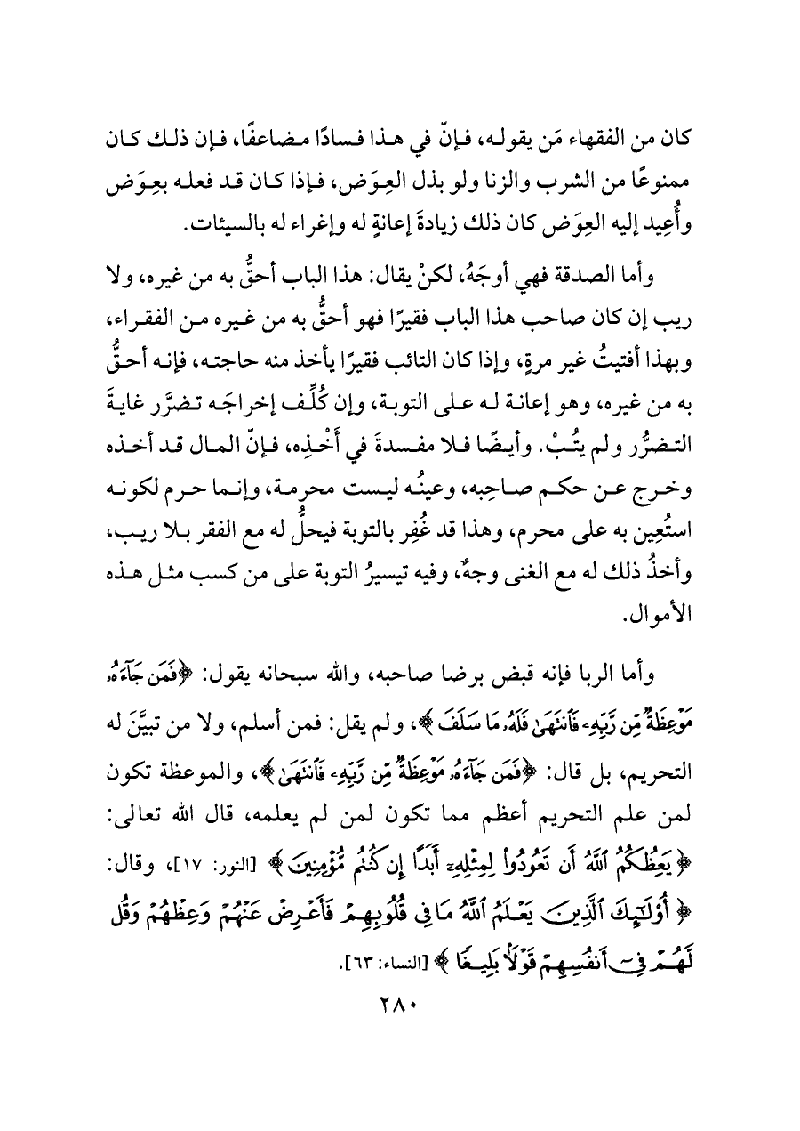 وأما الربا فإنه قبض برضا صاحبه، والله سبحانه يقول: {فَمَنْ جَاءَهُ مَوْعِظَةٌ مِنْ رَبِّهِ فَانْتَهَى فَلَهُ مَا سَلَفَ}، ولم يقل: فمن أسلم، ولا من تبيَّنَ له التحريم، بل قال: {فَمَنْ جَاءَهُ مَوْعِظَةٌ مِنْ رَبِّهِ فَانْتَهَى}، والموعظة تكون لمن علم التحريم أعظم مما تكون لمن لم يعلمه، قال الله تعالى: {يَعِظُكُمُ اللَّهُ أَنْ تَعُودُوا لِمِثْلِهِ أَبَدًا إِنْ كُنْتُمْ مُؤْمِنِينَ} [النور: ١٧]، وقال: {أُولَئِكَ الَّذِينَ يَعْلَمُ اللَّهُ مَا فِي قُلُوبِهِمْ فَأَعْرِضْ عَنْهُمْ وَعِظْهُمْ وَقُلْ لَهُمْ فِي أَنْفُسِهِمْ قَوْلًا بَلِيغًا} [النساء: ٦٣].