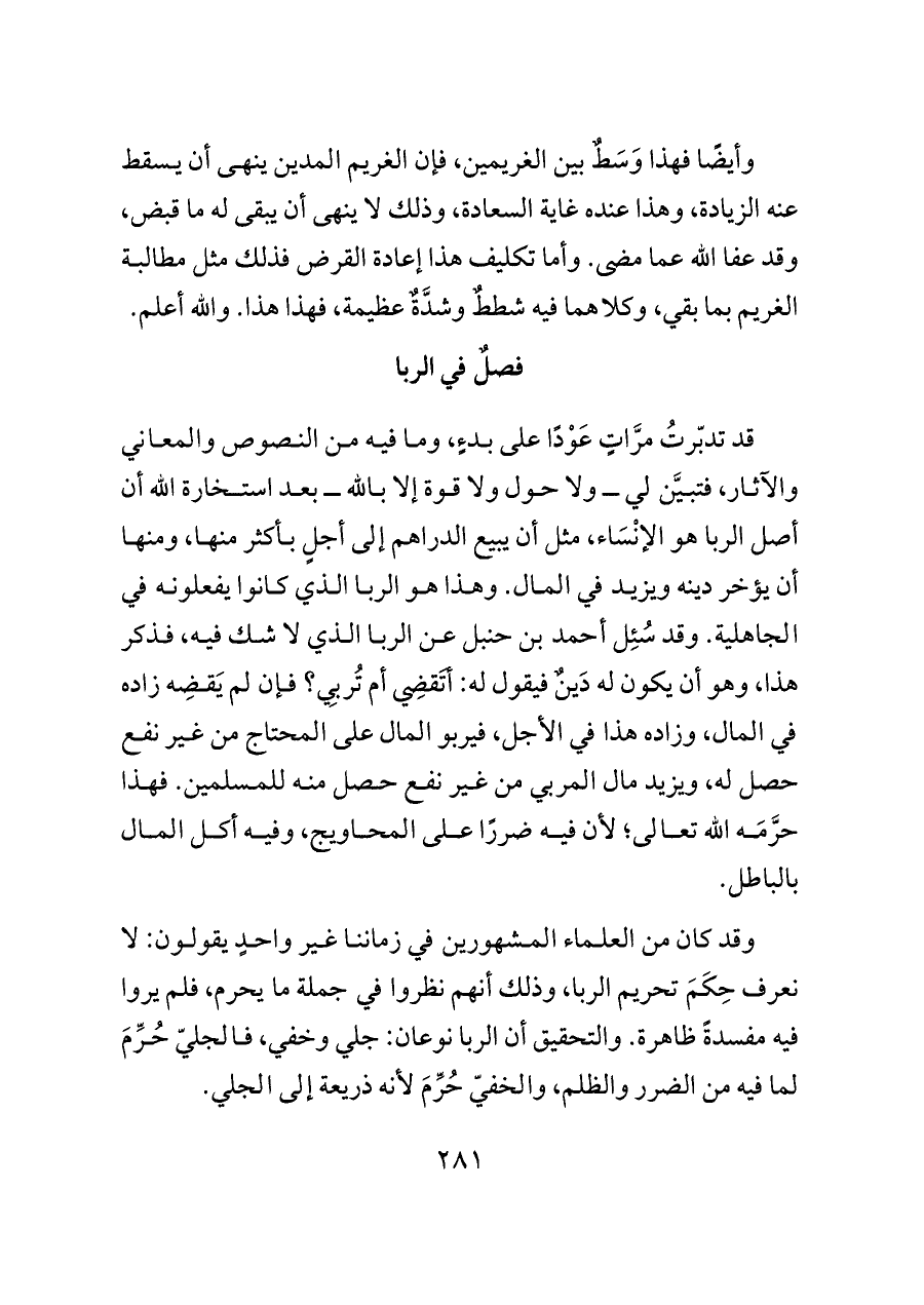 قد تدبّرتُ مرَّاتٍ عَوْدًا على بدءٍ، وما فيه من النصوص والمعاني والآثار، فتبيَّن لي ــ ولا حول ولا قوة إلا بالله ــ بعد استخارة الله أن أصل الربا هو الإنْسَاء، مثل أن يبيع الدراهم إلى أجلٍ بأكثر منها، ومنها أن يؤخر دينه ويزيد في المال. وهذا هو الربا الذي كانوا يفعلونه في الجاهلية. وقد سُئِل أحمد بن حنبل عن الربا الذي لا شك فيه، فذكر هذا، وهو أن يكون له دَينٌ فيقول له: أتَقضِي أم تُربِي؟ فإن لم يَقضِه زاده في المال، وزاده هذا في الأجل، فيربو المال على المحتاج من غير نفع حصل له، ويزيد مال المربي من غير نفع حصل منه للمسلمين. فهذا حرَّمَه الله تعالى؛ لأن فيه ضررًا على المحاويج، وفيه أكل المال بالباطل.