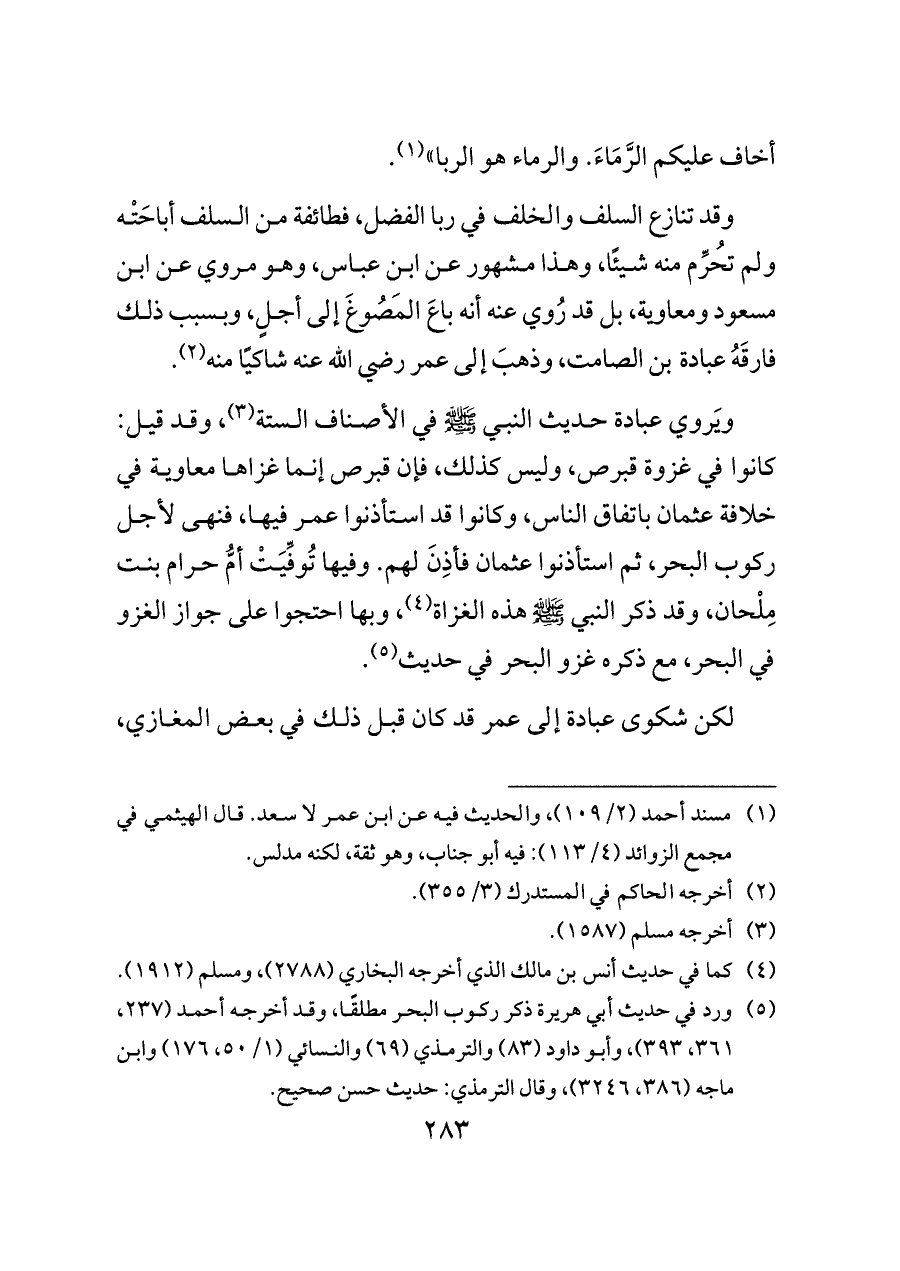 وقد تنازع السلف والخلف في ربا الفضل، فطائفة من السلف أباحَتْه ولم تُحرِّم منه شيئًا، وهذا مشهور عن ابن عباس، وهو مروي عن ابن مسعود ومعاوية، بل قد رُوي عنه أنه باعَ المَصُوغَ إلى أجلٍ، وبسبب ذلك فارقَهُ عبادة بن الصامت، وذهبَ إلى عمر رضي الله عنه شاكيًا منه (¬٢).