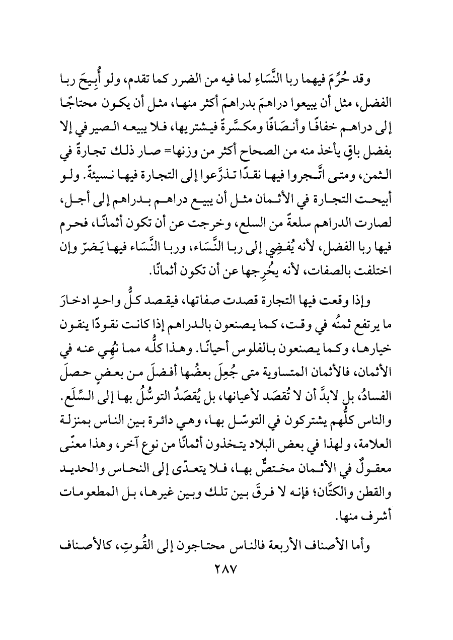 وإذا وقعت فيها التجارة قصدت صفاتها، فيقصد كلُّ واحدٍ ادخارَ ما يرتفع ثمنُه في وقت، كما يصنعون بالدراهم إذا كانت نقودًا ينقون خيارها، وكما يصنعون بالفلوس أحيانًا. وهذا كلُّه مما نُهِي عنه في الأثمان، فالأثمان المتساوية متى جُعِلَ بعضُها أفضلَ من بعضٍ حصلَ الفسادُ، بل لابدَّ أن لا تُقصَد لأعيانها، بل يُقصَدُ التوسُّلُ بها إلى السِّلَع. والناس كلُّهم يشتركون في التوسّل بها، وهي دائرة بين الناس بمنزلة العلامة، ولهذا في بعض البلاد يتخذون أثمانًا من نوع آخر، وهذا معنًى معقولٌ في الأثمان مختصٌّ بها، فلا يتعدّى إلى النحاس والحديد والقطن والكتَّان؛ فإنه لا فرقَ بين تلك وبين غيرها، بل المطعومات أشرف منها.