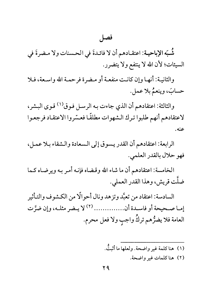 شُبَه الإباحية: اعتقادهم أن لا فائدةَ في الحسنات ولا مضرةَ في السيئات؛ لأن الله لا ينتفع ولا يتضرر.
