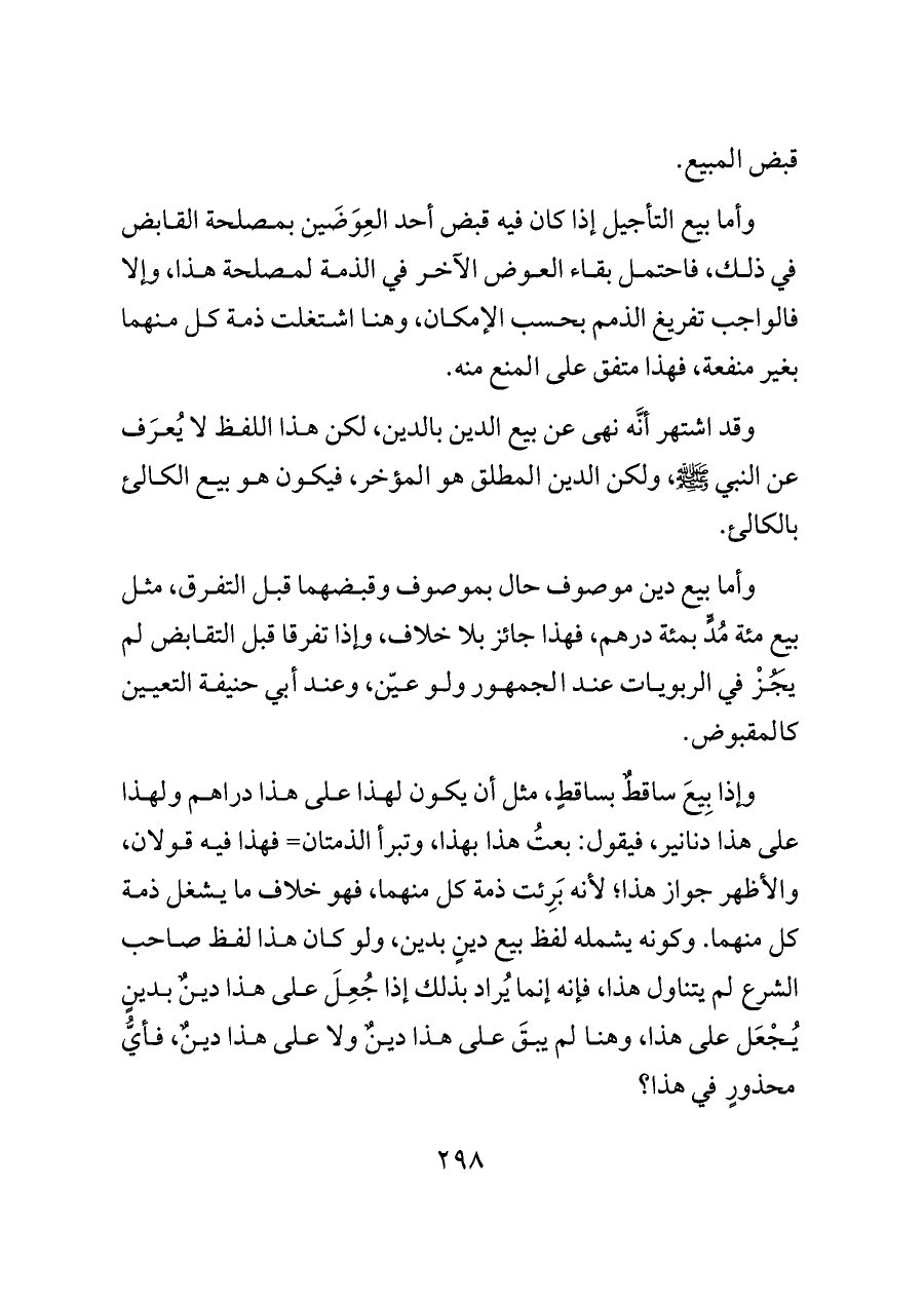 وإذا بِيعَ ساقطٌ بساقطٍ، مثل أن يكون لهذا على هذا دراهم ولهذا على هذا دنانير، فيقول: بعتُ هذا بهذا، وتبرأ الذمتان= فهذا فيه قولان، والأظهر جواز هذا؛ لأنه بَرِئت ذمة كل منهما، فهو خلاف ما يشغل ذمة كل منهما. وكونه يشمله لفظ بيع دينٍ بدين، ولو كان هذا لفظ صاحب الشرع لم يتناول هذا، فإنه إنما يُراد بذلك إذا جُعِلَ على هذا دينٌ بدينٍ يُجْعَل على هذا، وهنا لم يبقَ على هذا دينٌ ولا على هذا دينٌ، فأيُّ محذورٍ في هذا؟
