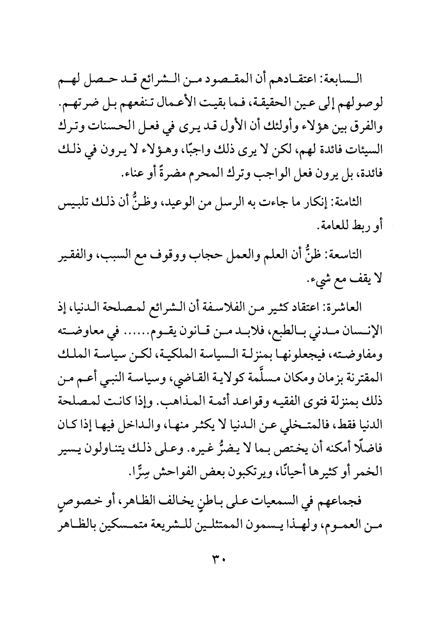 العاشرة: اعتقاد كثير من الفلاسفة أن الشرائع لمصلحة الدنيا، إذ الإنسان مدني بالطبع، فلابد من قانون يقوم ...... في معاوضته ومفاوضته، فيجعلونها بمنزلة السياسة الملكية، لكن سياسة الملك المقترنة بزمان ومكان مسلَّمة كولاية القاضي، وسياسة النبي أعم من ذلك بمنزلة فتوى الفقيه وقواعد أئمة المذاهب. وإذا كانت لمصلحة الدنيا فقط، فالمتخلي عن الدنيا لا يكثر منها، والداخل فيها إذا كان فاضلًا أمكنه أن يختص بما لا يضرُّ غيره. وعلى ذلك يتناولون يسير الخمر أو كثيرها أحيانًا، ويرتكبون بعض الفواحش سِرًّا.
