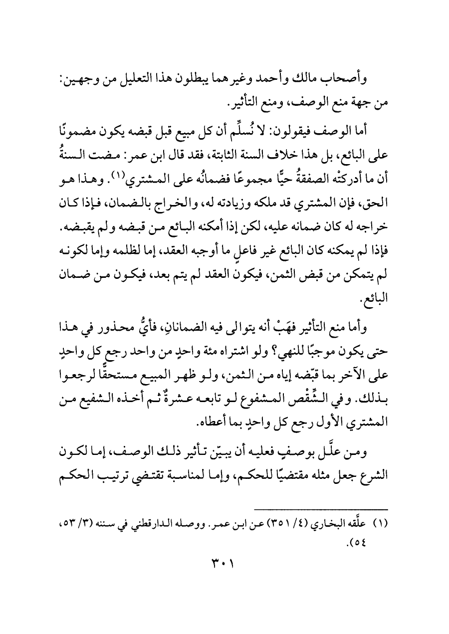 أما الوصف فيقولون: لا نُسلِّم أن كل مبيع قبل قبضه يكون مضمونًا على البائع، بل هذا خلاف السنة الثابتة، فقد قال ابن عمر: مضت السنةُ أن ما أدركتْه الصفقةُ حيًّا مجموعًا فضمانُه على المشتري (¬١). وهذا هو الحق، فإن المشتري قد ملكه وزيادته له، والخراج بالضمان، فإذا كان خراجه له كان ضمانه عليه، لكن إذا أمكنه البائع من قبضه ولم يقبضه. فإذا لم يمكنه كان البائع غير فاعلٍ ما أوجبه العقد، إما لظلمه وإما لكونه لم يتمكن من قبض الثمن، فيكون العقد لم يتم بعد، فيكون من ضمان البائع.