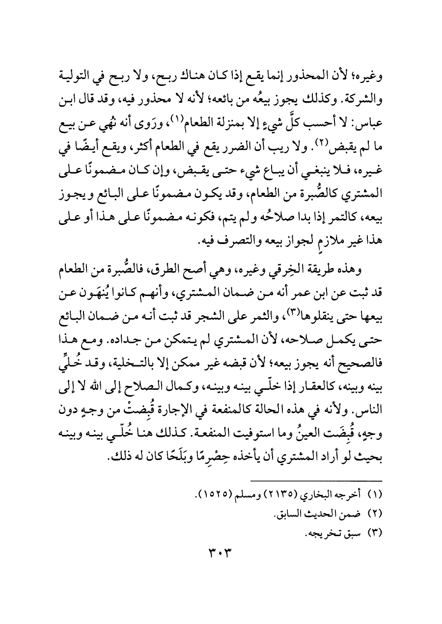 وهذه طريقة الخِرقي وغيره، وهي أصح الطرق، فالصُّبرة من الطعام قد ثبت عن ابن عمر أنه من ضمان المشتري، وأنهم كانوا يُنهَون عن بيعها حتى ينقلوها (¬٣)، والثمر على الشجر قد ثبت أنه من ضمان البائع حتى يكمل صلاحه، لأن المشتري لم يتمكن من جداده. ومع هذا فالصحيح أنه يجوز بيعه؛ لأن قبضه غير ممكن إلا بالتخلية، وقد خُلِّي بينه وبينه، كالعقار إذا خلّي بينه وبينه، وكمال الصلاح إلى الله لا إلى الناس. ولأنه في هذه الحالة كالمنفعة في الإجارة قُبِضتْ من وجهٍ دون وجهٍ، قُبِضَت العينُ وما استوفيت المنفعة. كذلك هنا خُلّي بينه وبينه بحيث لو أراد المشتري أن يأخذه حِصْرِمًا وبَلَحًا كان له ذلك.