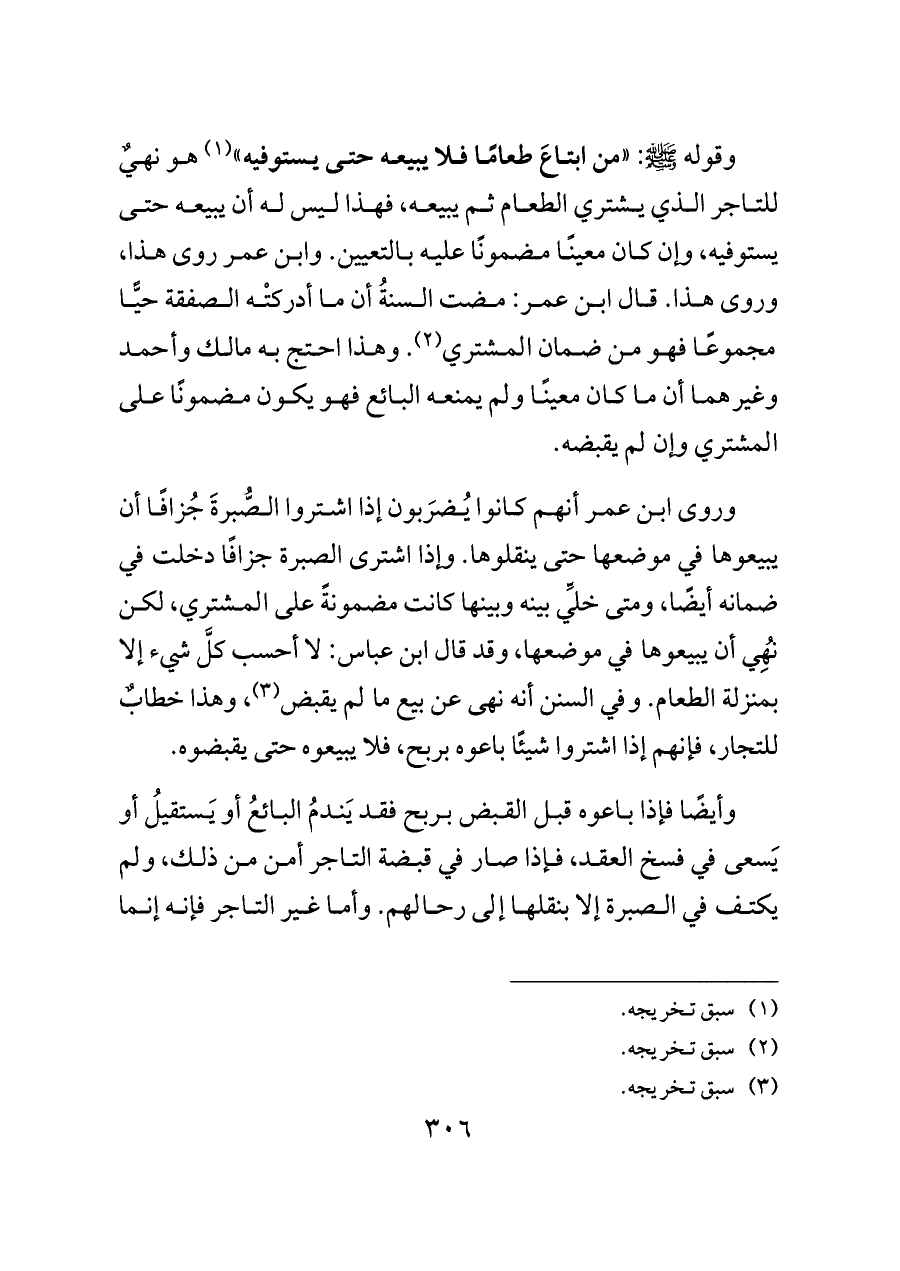 وقوله - صلى الله عليه وسلم -: «من ابتاعَ طعامًا فلا يبيعه حتى يستوفيه» (¬١) هو نهيٌ للتاجر الذي يشتري الطعام ثم يبيعه، فهذا ليس له أن يبيعه حتى يستوفيه، وإن كان معينًا مضمونًا عليه بالتعيين. وابن عمر روى هذا، وروى هذا. قال ابن عمر: مضت السنةُ أن ما أدركتْه الصفقة حيًّا مجموعًا فهو من ضمان المشتري (¬٢). وهذا احتج به مالك وأحمد وغيرهما أن ما كان معينًا ولم يمنعه البائع فهو يكون مضمونًا على المشتري وإن لم يقبضه.