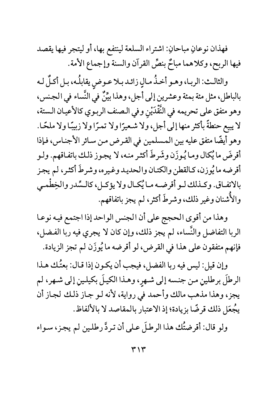 والثالث: الربا، وهو أخذُ مالٍ زائد بلا عوضٍ يقابلُه، بل أكلٌ له بالباطل، مثل مئة بمئة وعشرين إلى أجل، وهذا بيِّنٌ في النَّساء في الجنس، وهو متفق على تحريمه في النَّقْدَيْنِ وفي الصنف الربوي كالأعيان الستة، لا يبيع حنطةً بأكثر منها إلى أجل، ولا شعيرًا ولا تمرًا ولا زبيبًا ولا ملحًا. وهو أيضًا متفق عليه بين المسلمين في القرض من سائر الأجناس، فإذا أقرضَ ما يُكال وما يُوزَن وشَرطَ أكثر منه، لا يجوز ذلك باتفاقهم. ولو أقرضه ما يُوزن، كالقطن والكتان والحديد وغيره، وشرطَ أكثر، لم يجز بالاتفاق. وكذلك لو أقرضه ما يُكال ولا يؤكل، كالسِّدر والخِطْمي والأُشنان وغير ذلك، وشرطَ أكثر، لم يجز باتفاقهم.