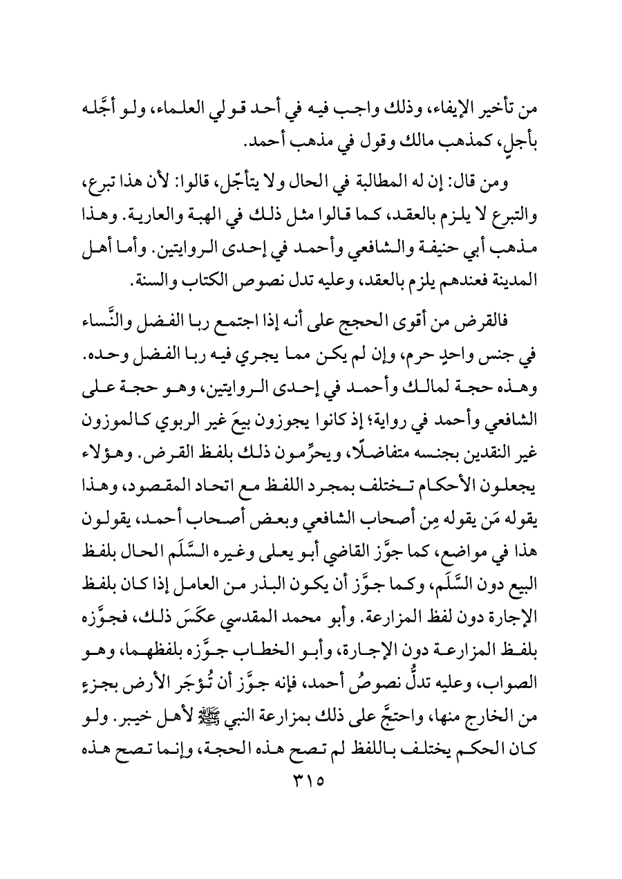 فالقرض من أقوى الحجج على أنه إذا اجتمع ربا الفضل والنَّساء في جنس واحدٍ حرم، وإن لم يكن مما يجري فيه ربا الفضل وحده. وهذه حجة لمالك وأحمد في إحدى الروايتين، وهو حجة على الشافعي وأحمد في رواية؛ إذ كانوا يجوزون بيعَ غير الربوي كالموزون غير النقدين بجنسه متفاضلًا، ويحرِّمون ذلك بلفظ القرض. وهؤلاء يجعلون الأحكام تختلف بمجرد اللفظ مع اتحاد المقصود، وهذا يقوله مَن يقوله مِن أصحاب الشافعي وبعض أصحاب أحمد، يقولون هذا في مواضع، كما جوَّز القاضي أبو يعلى وغيره السَّلَم الحال بلفظ البيع دون السَّلَم، وكما جوَّز أن يكون البذر من العامل إذا كان بلفظ الإجارة دون لفظ المزارعة. وأبو محمد المقدسي عكَسَ ذلك، فجوَّزه بلفظ المزارعة دون الإجارة، وأبو الخطاب جوَّزه بلفظهما، وهو الصواب، وعليه تدلُّ نصوصُ أحمد، فإنه جوَّز أن تُؤجَر الأرض بجزءٍ من الخارج منها، واحتجَّ على ذلك بمزارعة النبي - صلى الله عليه وسلم - لأهل خيبر. ولو كان الحكم يختلف باللفظ لم تصح هذه الحجة، وإنما تصح هذه