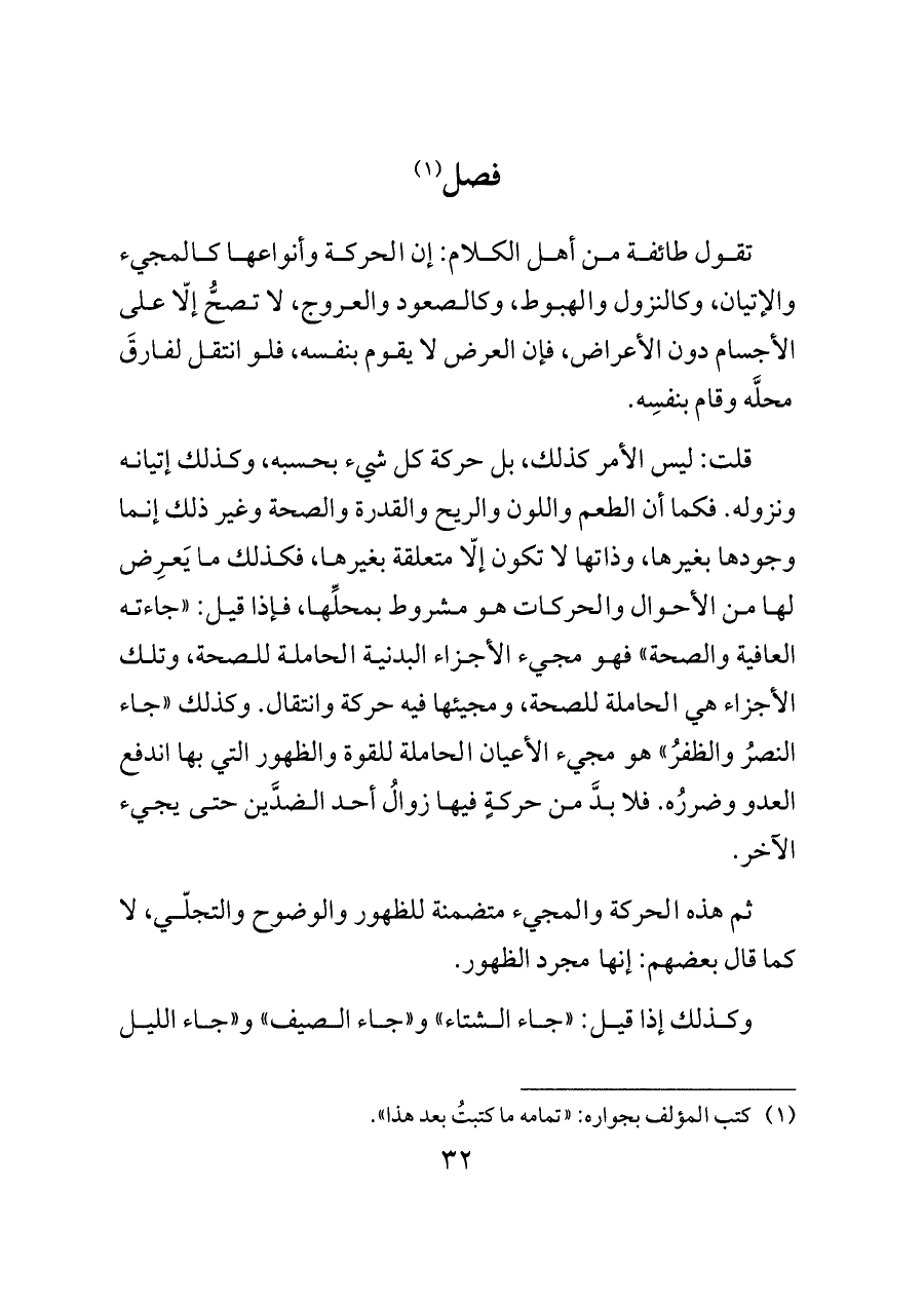 تقول طائفة من أهل الكلام: إن الحركة وأنواعها كالمجيء والإتيان، وكالنزول والهبوط، وكالصعود والعروج، لا تصحُّ إلّا على الأجسام دون الأعراض، فإن العرض لا يقوم بنفسه، فلو انتقل لفارقَ محلَّه وقام بنفسِه.
