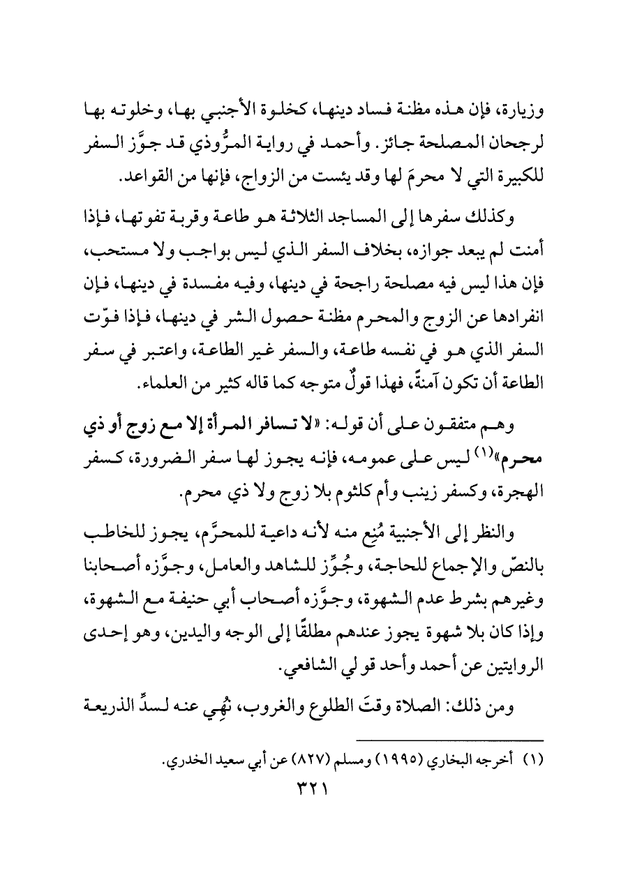 وكذلك سفرها إلى المساجد الثلاثة هو طاعة وقربة تفوتها، فإذا أمنت لم يبعد جوازه، بخلاف السفر الذي ليس بواجب ولا مستحب، فإن هذا ليس فيه مصلحة راجحة في دينها، وفيه مفسدة في دينها، فإن انفرادها عن الزوج والمحرم مظنة حصول الشر في دينها، فإذا فوّت السفر الذي هو في نفسه طاعة، والسفر غير الطاعة، واعتبر في سفر الطاعة أن تكون آمنةً، فهذا قولٌ متوجه كما قاله كثير من العلماء.