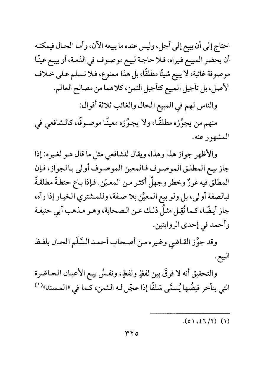 والأظهر جواز هذا وهذا، ويقال للشافعي مثل ما قال هو لغيره: إذا جاز بيع المطلق الموصوف فالمعين الموصوف أولى بالجواز، فإن المطلق فيه غررٌ وخطر وجهلٌ أكثر من المعيّن. فإذا باع حنطةً مطلقةً فبالصفة أولى، بل ولو بيع المعيَّن بلا صفة، وللمشتري الخيار إذا رآه، جاز أيضًا، كما نُقِل مثلُ ذلك عن الصحابة، وهو مذهب أبي حنيفة وأحمد في إحدى الروايتين.
