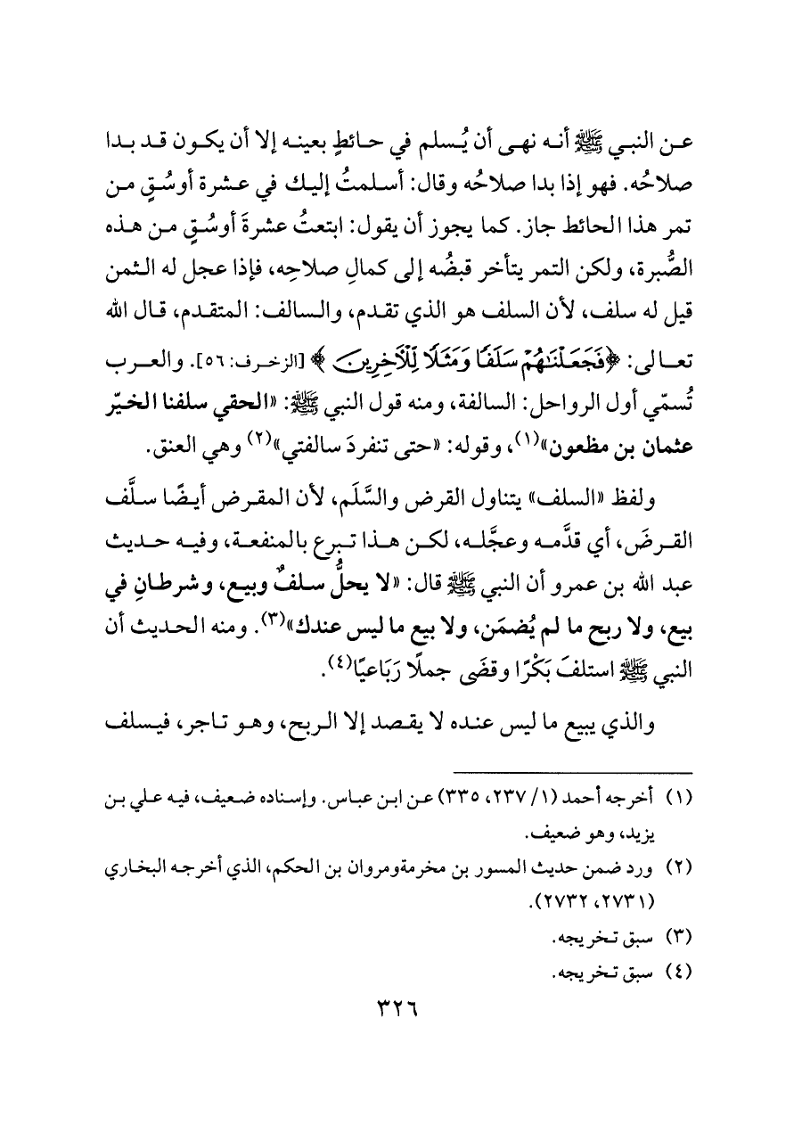 ولفظ «السلف» يتناول القرض والسَّلَم، لأن المقرض أيضًا سلَّف القرضَ، أي قدَّمه وعجَّله، لكن هذا تبرع بالمنفعة، وفيه حديث عبد الله بن عمرو أن النبي - صلى الله عليه وسلم - قال: «لا يحلُّ سلفٌ وبيع، وشرطانِ في بيع، ولا ربح ما لم يُضمَن، ولا بيع ما ليس عندك» (¬٣). ومنه الحديث أن النبي - صلى الله عليه وسلم - استلفَ بَكْرًا وقضَى جملًا رَبَاعيًا (¬٤).