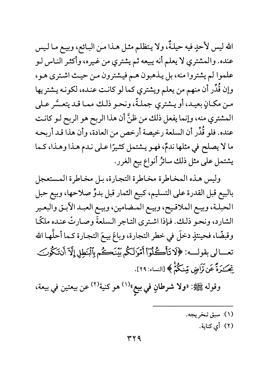 وليس هذه المخاطرة مخاطرة التجارة، بل مخاطرة المستعجل بالبيع قبل القدرة على التسليم، كبيع الثمار قبل بدوِّ صلاحها، وبيع حبل الحبلة، وبيع الملاقيح، وبيع المضامين، وبيع العبد الآبق والبعير الشارد، ونحو ذلك. فإذا اشترى التاجر السلعةَ وصارتْ عنده ملكًا وقبضًا، فحينئذٍ دخلَ في خطر التجارة، وباعَ بيعَ التجارة كما أحلَّها الله تعالى بقوله: {لَا تَأْكُلُوا أَمْوَالَكُمْ بَيْنَكُمْ بِالْبَاطِلِ إِلَّا أَنْ تَكُونَ تِجَارَةً عَنْ تَرَاضٍ مِنْكُمْ} [النساء: ٢٩].