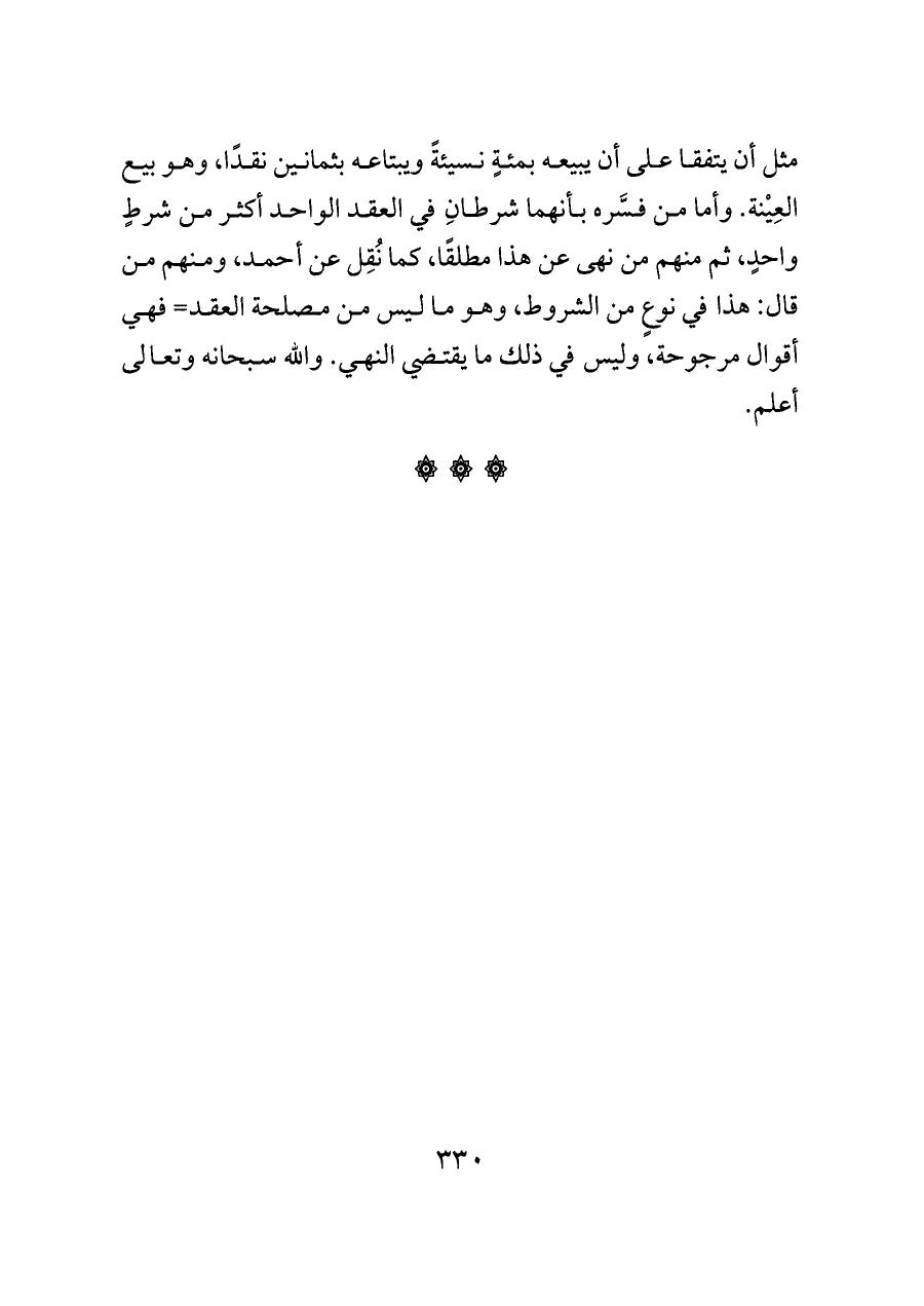 مثل أن يتفقا على أن يبيعه بمئةٍ نسيئةً ويبتاعه بثمانين نقدًا، وهو بيع العِيْنة. وأما من فسَّره بأنهما شرطانِ في العقد الواحد أكثر من شرطٍ واحدٍ، ثم منهم من نهى عن هذا مطلقًا، كما نُقِل عن أحمد، ومنهم من قال: هذا في نوعٍ من الشروط، وهو ما ليس من مصلحة العقد= فهي أقوال مرجوحة، وليس في ذلك ما يقتضي النهي. والله سبحانه وتعالى أعلم.