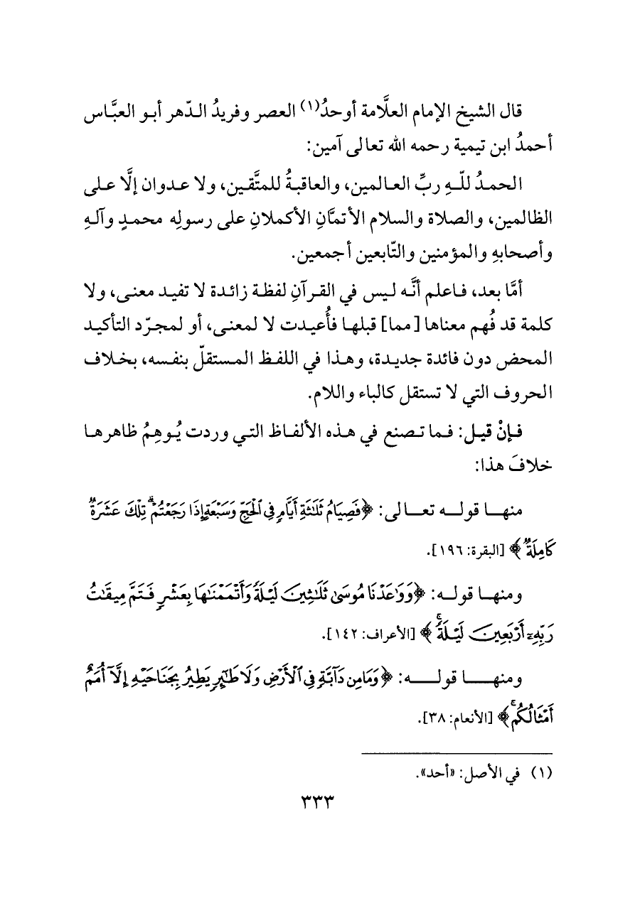 أمَّا بعد، فاعلم أنَّه ليس في القرآنِ لفظة زائدة لا تفيد معنى، ولا كلمة قد فُهم معناها [مما] قبلها فأُعيدت لا لمعنى، أو لمجرّد التأكيد المحض دون فائدة جديدة، وهذا في اللفظ المستقلّ بنفسه، بخلاف الحروف التي لا تستقل كالباء واللام.