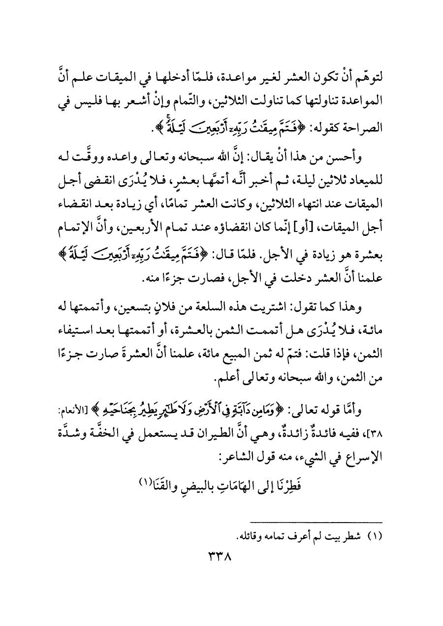وأحسن من هذا أنْ يقال: إنَّ الله سبحانه وتعالى واعده ووقَّت له للميعاد ثلاثين ليلة، ثم أخبر أنَّه أتمَّها بعشرٍ، فلا يُدْرَى انقضى أجل الميقات عند انتهاء الثلاثين، وكانت العشر تمامًا، أي زيادة بعد انقضاء أجل الميقات، [أو] إنّما كان انقضاؤه عند تمام الأربعين، وأنَّ الإتمام بعشرة هو زيادة في الأجل. فلمّا قال: {فَتَمَّ مِيقَاتُ رَبِّهِ أَرْبَعِينَ لَيْلَةً} علمنا أنَّ العشر دخلت في الأجل، فصارت جزءًا منه.