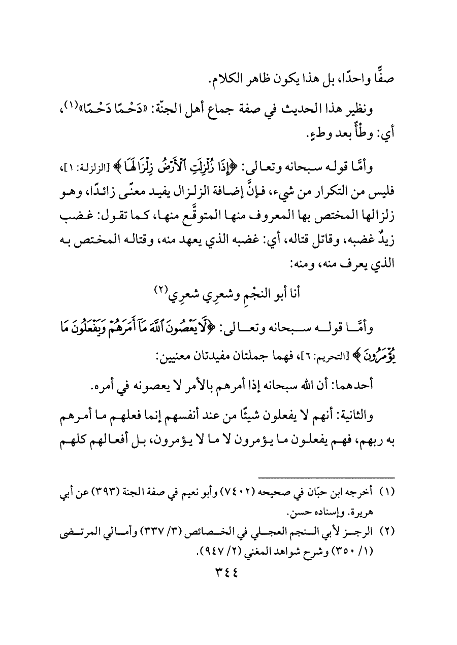 وأمَّا قوله سبحانه وتعالى: {إِذَا زُلْزِلَتِ الْأَرْضُ زِلْزَالَهَا} [الزلزلة: ١]، فليس من التكرار من شيء، فإنَّ إضافة الزلزال يفيد معنًى زائدًا، وهو زلزالها المختص بها المعروف منها المتوقَّع منها، كما تقول: غضب زيدٌ غضبه، وقاتل قتاله، أي: غضبه الذي يعهد منه، وقتاله المختص به الذي يعرف منه، ومنه: