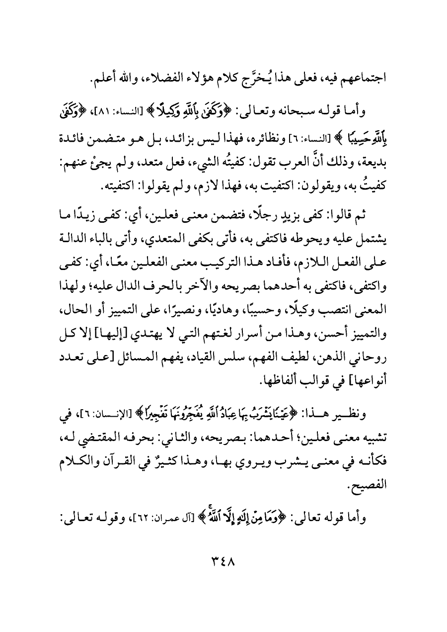 وأما قوله سبحانه وتعالى: {وَكَفَى بِاللَّهِ وَكِيلًا} [النساء: ٨١]، {وَكَفَى بِاللَّهِ حَسِيبًا} [النساء: ٦] ونظائره، فهذا ليس بزائد، بل هو متضمن فائدة بديعة، وذلك أنَّ العرب تقول: كفيتُه الشيء، فعل متعد، ولم يجئْ عنهم: كفيتُ به، ويقولون: اكتفيت به، فهذا لازم، ولم يقولوا: اكتفيته.
