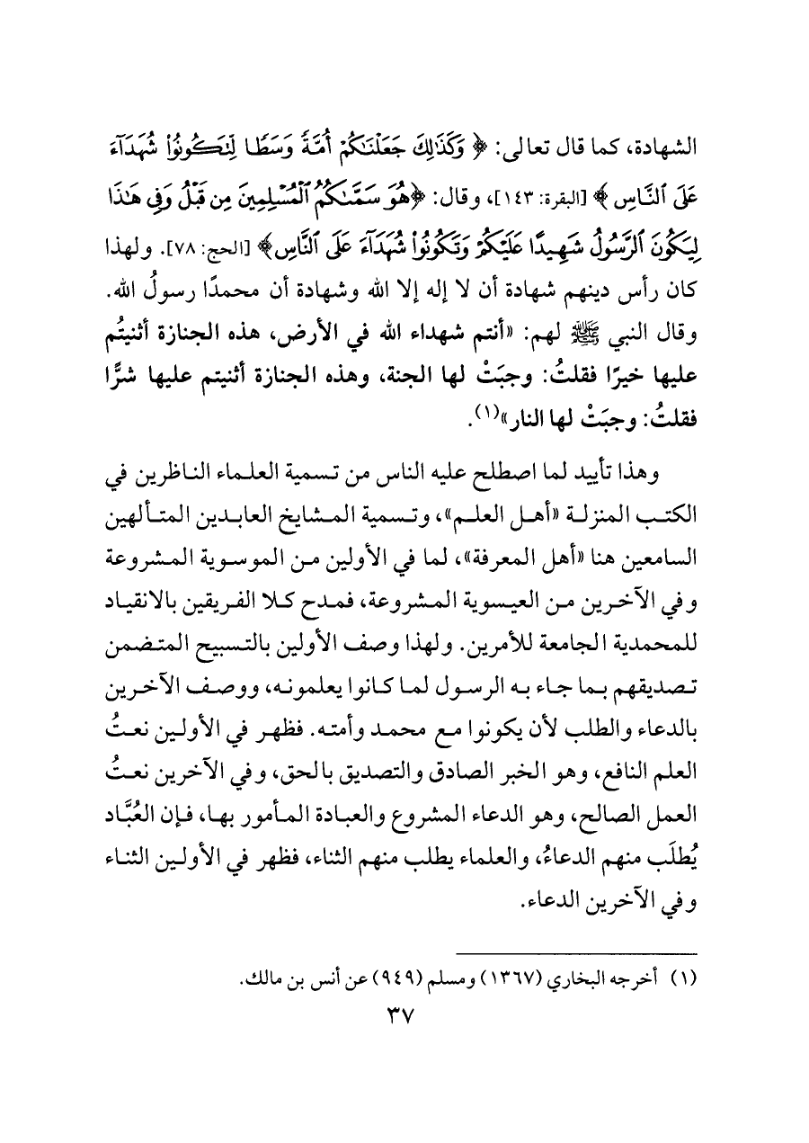 الشهادة، كما قال تعالى: {وَكَذَلِكَ جَعَلْنَاكُمْ أُمَّةً وَسَطًا لِتَكُونُوا شُهَدَاءَ عَلَى النَّاسِ} [البقرة: ١٤٣]، وقال: {هُوَ سَمَّاكُمُ الْمُسْلِمِينَ مِنْ قَبْلُ وَفِي هَذَا لِيَكُونَ الرَّسُولُ شَهِيدًا عَلَيْكُمْ وَتَكُونُوا شُهَدَاءَ عَلَى النَّاسِ} [الحج: ٧٨]. ولهذا كان رأس دينهم شهادة أن لا إله إلا الله وشهادة أن محمدًا رسولُ الله. وقال النبي - صلى الله عليه وسلم - لهم: «أنتم شهداء الله في الأرض، هذه الجنازة أثنيتُم عليها خيرًا فقلتُ: وجبَتْ لها الجنة، وهذه الجنازة أثنيتم عليها شرًّا فقلتُ: وجبَتْ لها النار» (¬١).