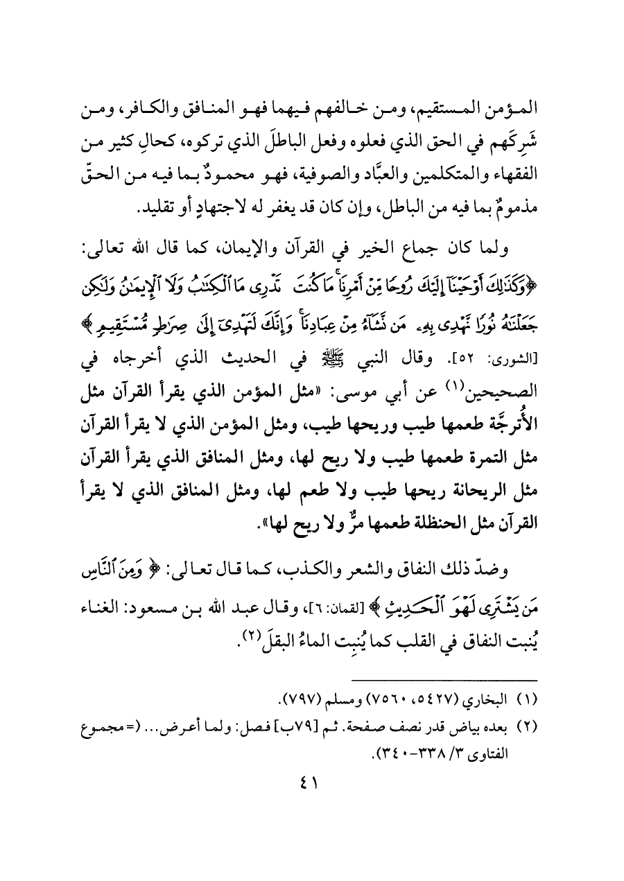 ولما كان جماع الخير في القرآن والإيمان، كما قال الله تعالى: {وَكَذَلِكَ أَوْحَيْنَا إِلَيْكَ رُوحًا مِنْ أَمْرِنَا مَا كُنْتَ تَدْرِي مَا الْكِتَابُ وَلَا الْإِيمَانُ وَلَكِنْ جَعَلْنَاهُ نُورًا نَهْدِي بِهِ مَنْ نَشَاءُ مِنْ عِبَادِنَا وَإِنَّكَ لَتَهْدِي إِلَى صِرَاطٍ مُسْتَقِيمٍ} [الشورى: ٥٢]. وقال النبي - صلى الله عليه وسلم - في الحديث الذي أخرجاه في الصحيحين (¬١) عن أبي موسى: «مثل المؤمن الذي يقرأ القرآن مثل الأُترجَّة طعمها طيب وريحها طيب، ومثل المؤمن الذي لا يقرأ القرآن مثل التمرة طعمها طيب ولا ريح لها، ومثل المنافق الذي يقرأ القرآن مثل الريحانة ريحها طيب ولا طعم لها، ومثل المنافق الذي لا يقرأ القرآن مثل الحنظلة طعمها مرٌّ ولا ريح لها».