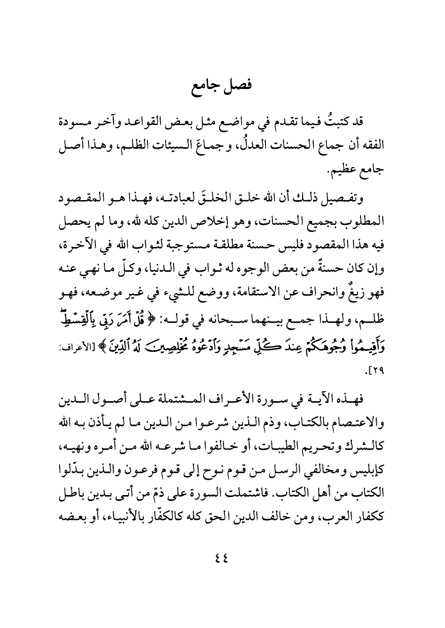 قد كتبتُ فيما تقدم في مواضع مثل بعض القواعد وآخر مسودة الفقه أن جماع الحسنات العدلُ، وجماعَ السيئات الظلم، وهذا أصل جامع عظيم.