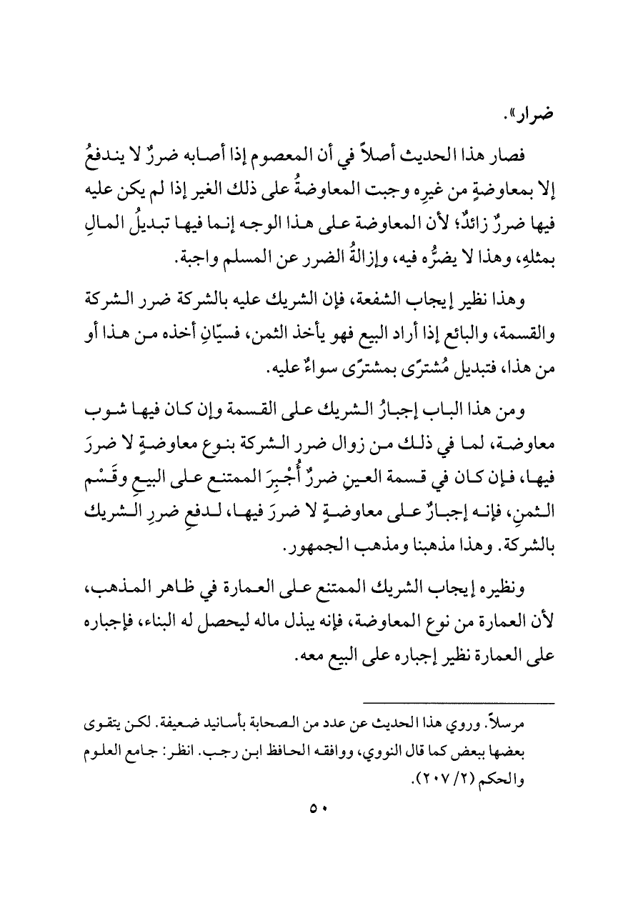 ومن هذا الباب إجبارُ الشريك على القسمة وإن كان فيها شوب معاوضة، لما في ذلك من زوال ضرر الشركة بنوع معاوضةٍ لا ضررَ فيها، فإن كان في قسمة العينِ ضررٌ أُجْبِرَ الممتنع على البيعِ وقَسْم الثمنِ، فإنه إجبارٌ على معاوضةٍ لا ضررَ فيها، لدفعِ ضررِ الشريك بالشركة. وهذا مذهبنا ومذهب الجمهور.