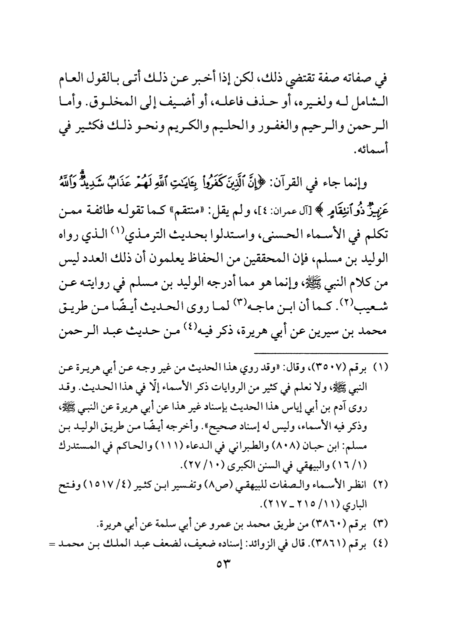 وإنما جاء في القرآن: {إِنَّ الَّذِينَ كَفَرُوا بِآيَاتِ اللَّهِ لَهُمْ عَذَابٌ شَدِيدٌ وَاللَّهُ عَزِيزٌ ذُو انْتِقَامٍ} [آل عمران: ٤]، ولم يقل: "منتقم" كما تقوله طائفة ممن تكلم في الأسماء الحسنى، واستدلوا بحديث الترمذي (¬١) الذي رواه الوليد بن مسلم، فإن المحققين من الحفاظ يعلمون أن ذلك العدد ليس من كلام النبي - صلى الله عليه وسلم -، وإنما هو مما أدرجه الوليد بن مسلم في روايته عن شعيب (¬٢). كما أن ابن ماجه (¬٣) لما روى الحديث أيضًا من طريق محمد بن سيرين عن أبي هريرة، ذكر فيه (¬٤) من حديث عبد الرحمن