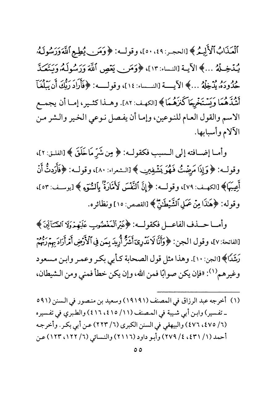 وأما حذف الفاعل فكقوله: {غَيْرِ الْمَغْضُوبِ عَلَيْهِمْ وَلَا الضَّالِّينَ} [الفاتحة: ٧]، وقول الجن: {وَأَنَّا لَا نَدْرِي أَشَرٌّ أُرِيدَ بِمَنْ فِي الْأَرْضِ أَمْ أَرَادَ بِهِمْ رَبُّهُمْ رَشَدًا} [الجن: ١٠]. وهذا مثل قول الصحابة كأبي بكر وعمر وابن مسعود وغيرهم (¬١): "فإن يكن صوابًا فمن الله، وإن يكن خطأ فمني ومن الشيطان،